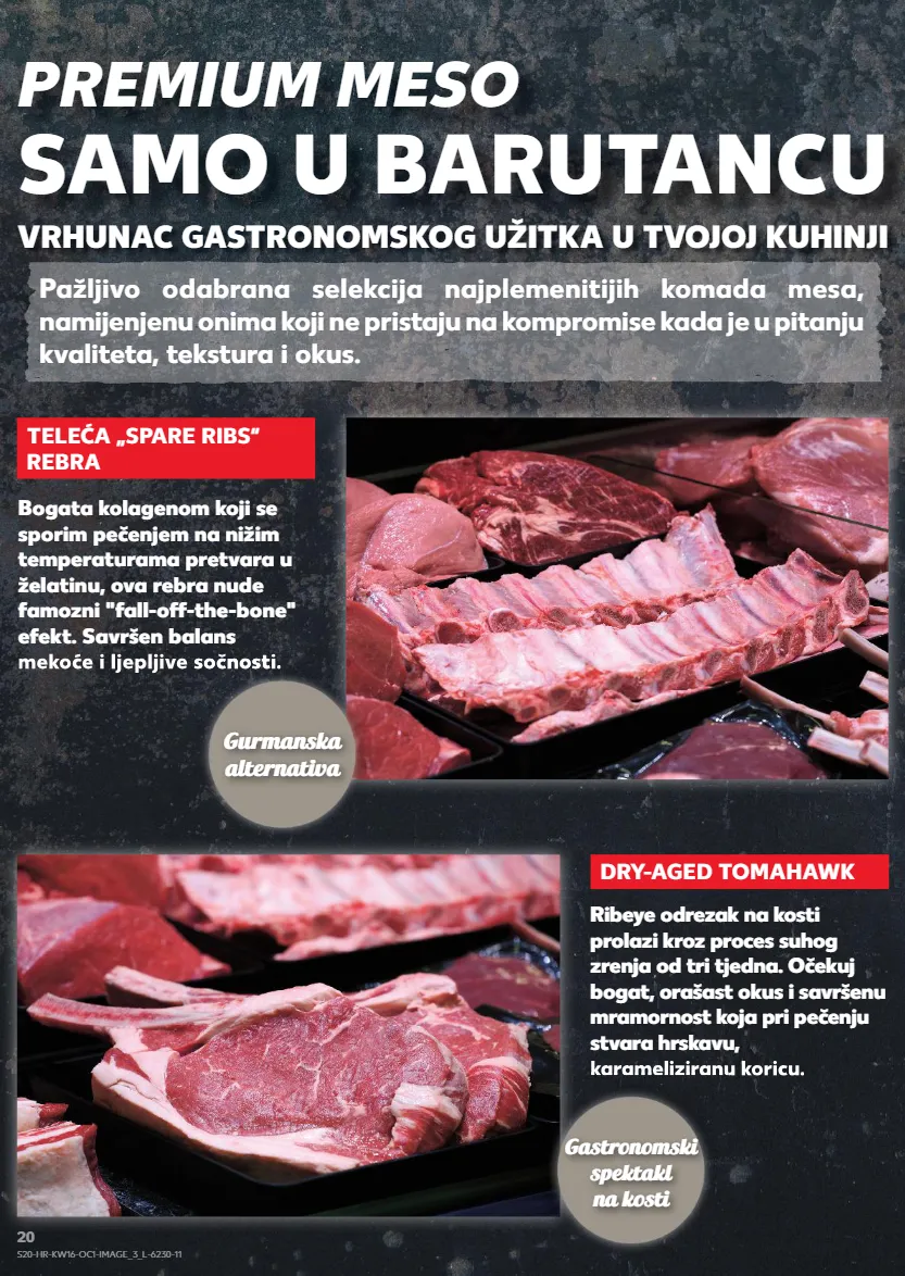 TELEĆA „SPARE RIBS“ REBRA Bogata kolagenom koji se sporim pečenjem na nižim temperaturama pretvara u želatinu, ova rebra nude famozni "fall-off-the-bone" efekt. Savršen balans mekoće i ljepljive sočnosti. mekoće i ljepljive sočnosti. mekoće i ljepljive sočnosti. Gurmanska alternativa DRY-AGED TOMAHAWK Ribeye odrezak na kosti prolazi kroz proces suhog zrenja od tri tjedna. Očekuj bogat, orašast okus i savršenu mramornost koja pri pečenju stvara hrskavu, karameliziranu koricu. karameliziranu koricu. Gastronomski spektakl na kosti PREMIUM MESO SAMO U BARUTANCU Pažljivo odabrana selekcija najplemenitijih komada mesa, namijenjenu onima koji ne pristaju na kompromise kada je u pitanju kvaliteta, tekstura i okus. VRHUNAC GASTRONOMSKOG UŽITKA U TVOJOJ KUHINJI S20-HR-KW16-OC1-IMAGE_3_L-6230-11 20