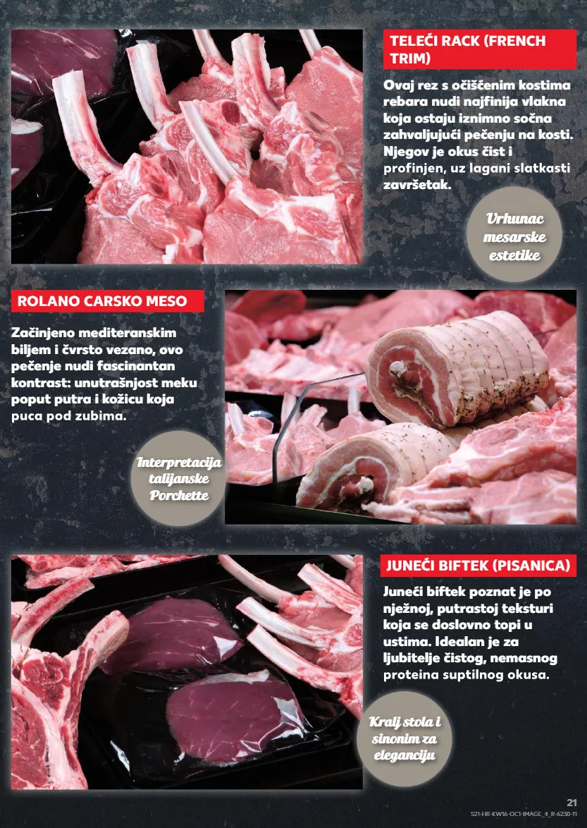 juneći biftek poznat je po nježnoj, putrastoj teksturi koja se doslovno topi u ustima. idealan je za ljubitelje čistog, nemasnog proteina suptilnog okusa. teleći rack (french trim) ovaj rez s očišćenim kostima rebara nudi najfinija vlakna koja ostaju iznimno sočna zahvaljujući pečenju na kosti. njegov je okus čist i profinjen, uz lagani slatkasti završetak. profinjen, uz lagani slatkasti vrhunac mesarske estetike rolano carsko meso začinjeno mediteranskim biljem i čvrsto vezano, ovo pečenje nudi fascinantan kontrast: unutrašnjost meku poput putra i kožicu koja puca pod zubima. puca pod zubima. interpretacija talijanske porchette proteina suptilnog okusa. kralj stola i sinonim za eleganciju juneći biftek (pisanica) s21-hr-kw16-oc1-image_4_r-6230-11 21