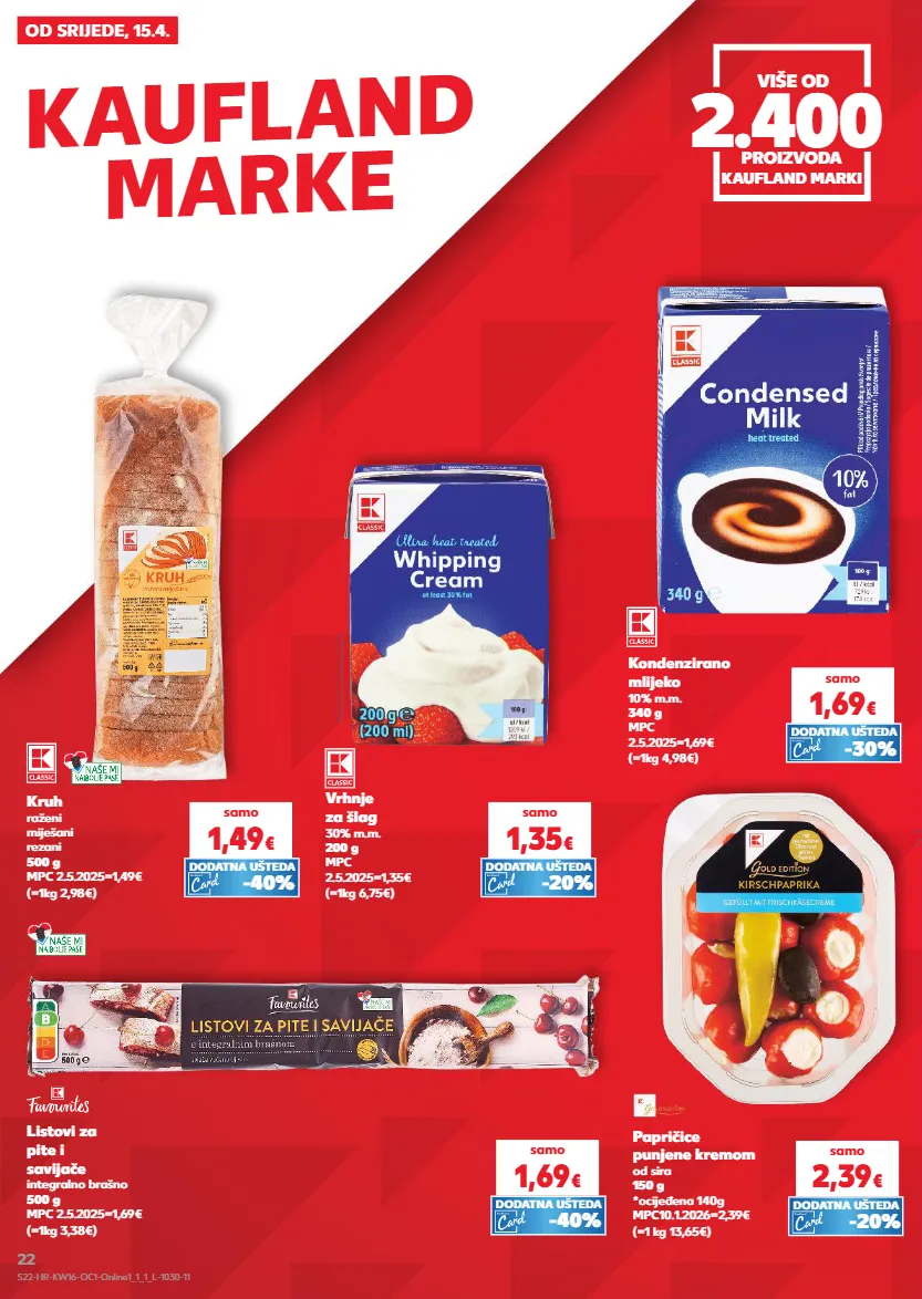 2.400 proizvoda kaufland marki više od od srijede, 15.4. kaufland marke (=1 kg 13,65€) papričice punjene kremom od sira 150 g *ocijeđena 140g mpc10.1.2026=2,39€ (=1kg 3,38€) listovi za pite i savijače integralno brašno 500 g mpc 2.5.2025=1,69€ (=1kg 2,98€) kruh raženi miješani rezani 500 g mpc 2.5.2025=1,49€ (=1kg 4,98€) kondenzirano mlijeko 10% m.m. 340 g mpc 2.5.2025=1,69€ samo 1,69 € samo 1,49 € samo 2,39 € samo 1,69 € (=1kg 6,75€) vrhnje za šlag 30% m.m. 200 g mpc 2.5.2025=1,35€ samo 1,35 € -40% dodatna ušteda -20% dodatna ušteda -40% dodatna ušteda -20% dodatna ušteda -30% dodatna ušteda s22-hr-kw16-oc1-online1_1_1_l-1030-11 22