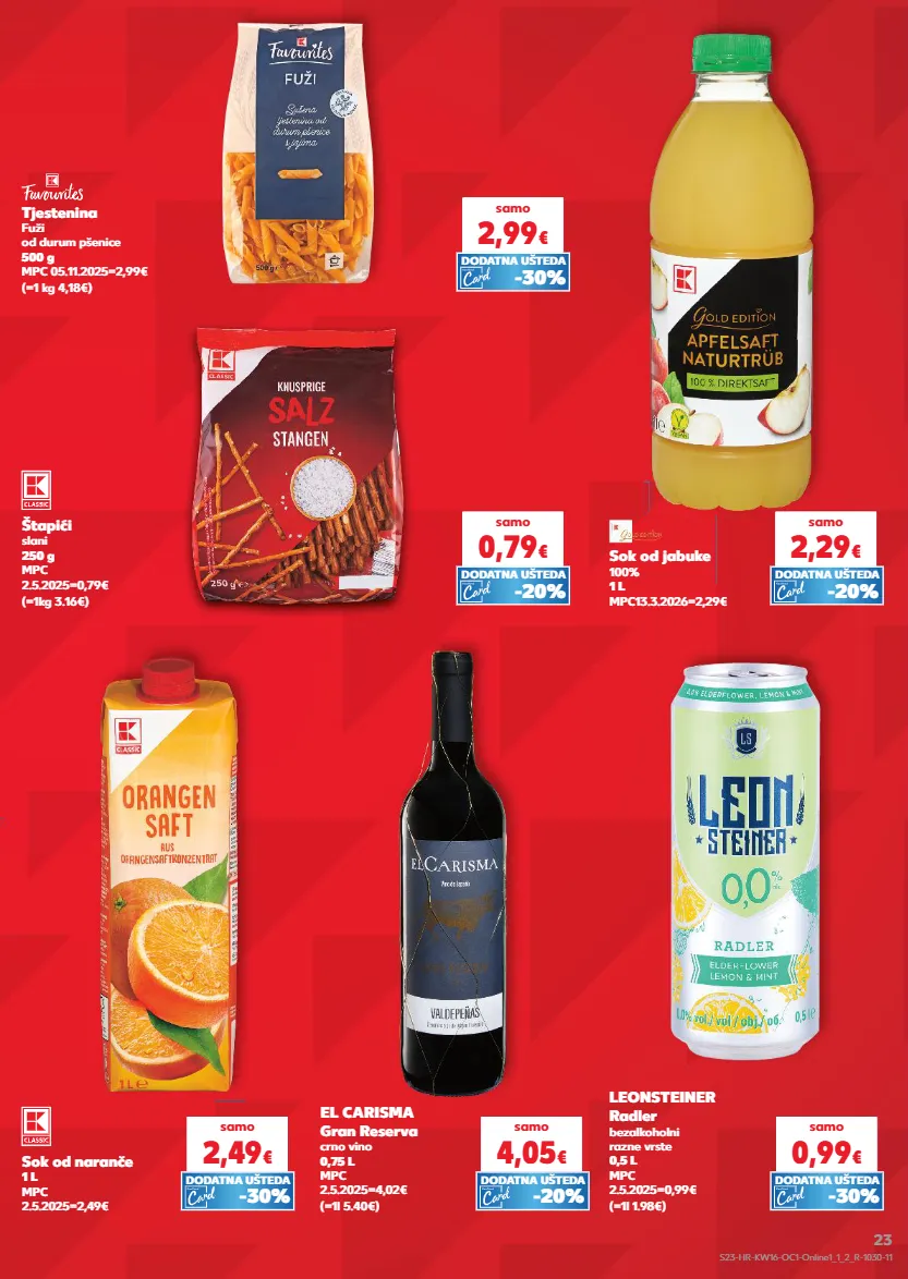 (=1 kg 4,18€) tjestenina fuži od durum pšenice 500 g mpc 05.11.2025=2,99€ sok od naranče 1 l mpc 2.5.2025=2,49€ (=1kg 3.16€) štapići slani 250 g mpc 2.5.2025=0,79€ sok od jabuke 100% 1 l mpc13.3.2026=2,29€ samo 2,49 € -30% dodatna ušteda (=1l 1.98€) leonsteiner radler bezalkoholni razne vrste 0,5 l mpc 2.5.2025=0,99€ samo 0,99 € -30% dodatna ušteda (=1l 5.40€) el carisma gran reserva crno vino 0,75 l mpc 2.5.2025=4,02€ samo 4,05 € -20% dodatna ušteda samo 0,79 € -20% dodatna ušteda samo 2,99 € -30% dodatna ušteda samo 2,29 € -20% dodatna ušteda s23-hr-kw16-oc1-online1_1_2_r-1030-11 23