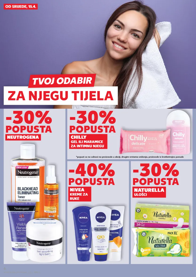 od srijede, 15.4. neutrogena -30% popusta *popust se ne odnosi na proizvode u akciji, drugim vrstama sniženja, proizvode iz kratkotrajne ponude nivea kreme za ruke -40% popusta chilly gel ili maramice za intimnu njegu -30% popusta naturella ulošci -30% popusta za njegu tijela za njegu tijela tvoj odabir s6-hr-kw16-oc1-online1_2_3_l-1030-11 6