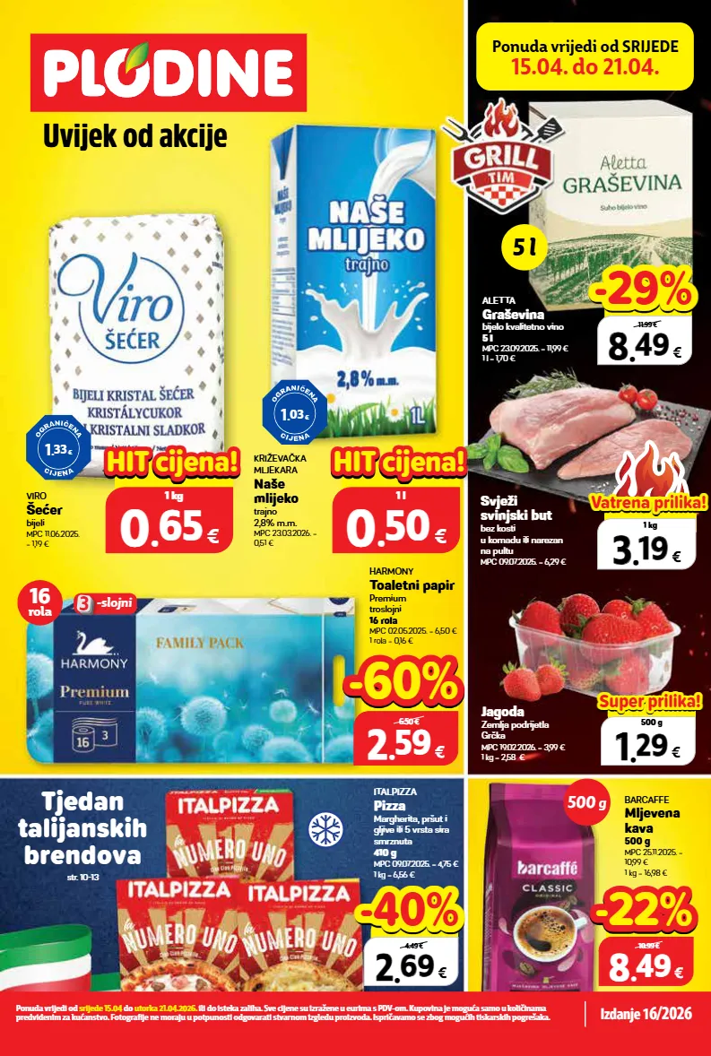 harmony toaletni papir premium troslojni 16 rola mpc 02.05.2025. = 6,50 € 1 rola = 0,16 € viro šećer bijeli mpc 11.06.2025. = 1,19 € italpizza pizza margherita, pršut i gljive ili 5 vrsta sira smrznuta 410 g mpc 09.07.2025. = 4,75 € 1 kg = 6,56 € barcaffe mljevena kava 500 g mpc 25.11.2025. = 10,99 € 1 kg = 16,98 € 1 . 33 € 1 . 03 € aletta graševina bijelo kvalitetno vino 5 l mpc 23.09.2025. = 11,99 € 1 l = 1,70 € svježi svinjski but bez kosti u komadu ili narezan na pultu mpc 09.07.2025. = 6,29 € jagoda zemlja podrijetla grčka mpc 19.02.2026. = 3,99 € 1 kg = 2,58 € križevačka mljekara naše mlijeko trajno 2,8% m.m. mpc 23.03.2026. = 0,51 € top cijena! već od hit cijena! 0 0 . . 50 50 € 1 l hit hit cijena! cijena! top cijena! već od hit cijena! 0 0 . . 65 65 € 1 kg hit hit cijena! cijena! top cijena! već od hit cijena! 1 1 . . 29 29 € 500 g super prilika! super prilika! tjedan talijanskih brendova str. 10-13 5 l ponuda vrijedi od srijede 15.04. do 21.04. ponuda vrijedi od srijede 15.04 do utorka 21.04.2026. ili do isteka zaliha. sve cijene su izražene u eurima s pdv-om. kupovina je moguća samo u količinama predviđenim za kućanstvo. fotografije ne moraju u potpunosti odgovarati stvarnom izgledu proizvoda. ispričavamo se zbog mogućih tiskarskih pogrešaka. izdanje 1 6/2026 500 g uvijek od akcije -slojni 3 16 rola 2 2 . . 59 59 € 16 rola 6.50 € -60% -60% 2 2 . . 69 69 € xxxxx 4.49 € -40% -40% 8 8 . . 49 49 € 500 g 10.99 € -22% -22% 8 8 . . 49 49 € xxxxx 11.99 € -29% -29% top cijena! već od hit cijena! 3 3 . . 19 19 € 1 kg vatrena prilika! vatrena prilika!