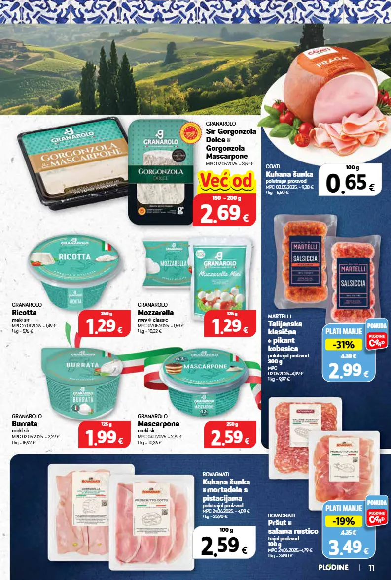 1 1 . . 29 29 € 250 g 1 1 . . 99 99 € 125 g 2 2 . . 59 59 € 250 g granarolo mascarpone meki sir mpc 04.11.2025. = 2,79 € 1 kg = 10,36 € granarolo burrata meki sir mpc 02.05.2025. = 2,29 € 1 kg = 15,92 € rovagnati kuhana šunka ili mortadela s pistacijama polutrajni proizvod mpc 24.06.2025. = 4,09 € 1 kg = 25,90 € granarolo mozzarella mini ili classic mpc 02.05.2025. = 1,59 € 1 kg = 10,32 € granarolo ricotta meki sir mpc 27.01.2026. = 1,49 € 1 kg = 5,16 € coati kuhana šunka polutrajni proizvod mpc 02.05.2025. = 9,28 € 1 kg = 6,50 € 0 0 . . 65 65 € 100 g 2 2 . . 59 59 € 100 g granarolo sir gorgonzola dolce ili gorgonzola mascarpone mpc 02.05.2025. = 3,59 € plati manje 4.39 € -31% -31% 2 2 . . 99 99 € ponuda martelli talijanska klasična ili pikant kobasica polutrajni proizvod 300 g mpc 02.05.2025.=4,39 € 1 kg = 9,97 € plati manje 4.35 € -19% -19% 3 3 . . 49 49 € ponuda rovagnati pršut ili salama rustico trajni proizvod 100 g mpc 24.06.2025.=4,79 € 1 kg = 34,90 € 11 1 1 . . 29 29 € 125 g top cijena! već od hit cijena! 2 2 . . 69 69 € 150 - 200 g već od već od