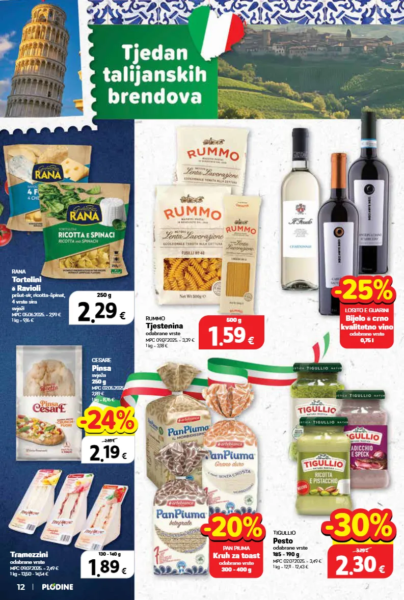 cesare pinsa svježa 250 g mpc 02.05.2025. = 2,89 € 1 kg = 8,76 € tramezzini odabrane vrste mpc 09.07.2025. = 2,49 € 1 kg = 13,50 - 14,54 € rana tortelini ili ravioli pršut-sir, ricotta-špinat, 4 vrste sira svježi mpc 05.06.2025. = 2,99 € 1 kg = 9,16 € rummo tjestenina odabrane vrste mpc 09.07.2025. = 3,39 € 1 kg = 3,18 € 1 1 . . 59 59 € 500 g tigullio pesto odabrane vrste 185 - 190 g mpc 02.07.2025. = 3,49 € 1 kg = 12,11 - 12,43 € 12 2 2 . . 29 29 € 250 g 1 1 . . 89 89 € 130 - 140 g 2 2 . . 19 19 € xxxxx 2.89 € -24% -24% losito e guarini bijelo ili crno kvalitetno vino odabrane vrste 0,75 l -25% -25% 2 2 . . 30 30 € 185 - 190 g 3.29 € -30% -30% pan piuma kruh za toast odabrane vrste 300 - 400 g -20% -20%