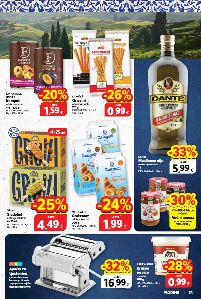 gruvi sladoled pistacija ili kikiriki 4x 75 ml mpc 03.07.2025. = 5,99 € 1 l = 14,97 € il buon pane krušne mrvice u kantici 400 g mpc 09.07.2025. = 1,49 € 1 kg = 2,48 € dante maslinovo ulje ekstra djevičansko 1 l mpc 16.08.2025. = 9,59 € aparat za tjesteninu • jednostavan za korištenje i idealan za pripremu svježe domaće tjestenine a b c melegatti croissant odabrane vrste 300 g mpc 25.10.2025. = 2,65 € 1 kg = 6,63 € la mole grissini odabrane vrste 125 g mpc 02.05.2025. = 1,34 € 1 kg = 7,92 € fattoria dei sapori kompot odabrane vrste 415 - 420 g mpc 19.07.2025. = 2,19 € 1 kg = 3,78 - 3,83 € 4 x 75 ml 13 5 5 . . 99 99 € xxxxx 8.99 € -33% -33% 16 16 . . 99 99 € xxxxx 24.99 € -32% -32% 1 1 . . 99 99 € 300 g 2.65 € -24% -24% 4 4 . . 49 49 € 300 g 5.99 € -25% -25% 0 0 . . 99 99 € 185 - 190 g 1.39 € -28% -28% 0 0 . . 99 99 € 125 g 1.34 € -26% -26% 1 1 . . 59 59 € 415 - 420 g 1.99 € -20% -20% conserve della nonna voćni namaz odabrane vrste 330 - 350 g -30% -30%