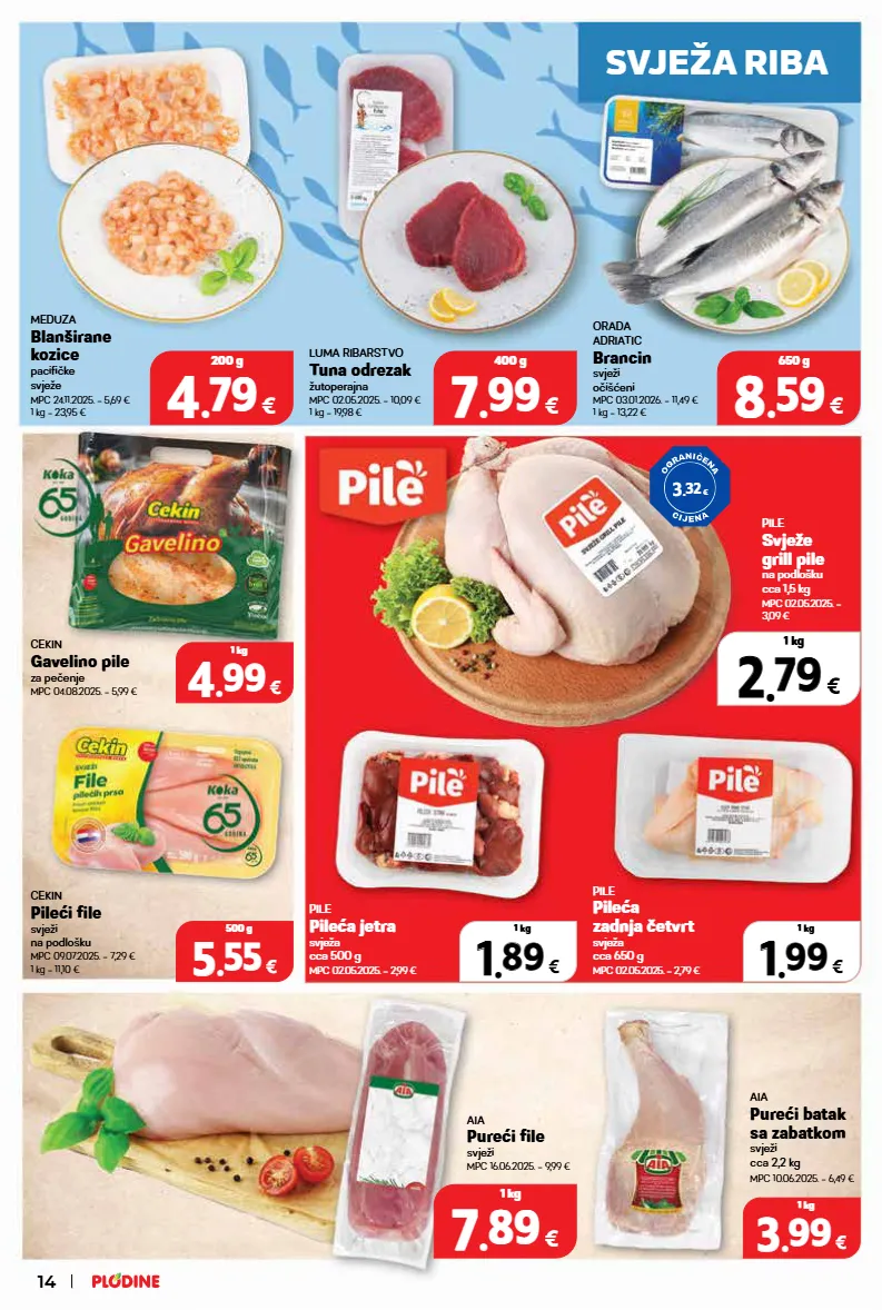meduza blanširane kozice pacifičke svježe mpc 24.11.2025. = 5,69 € 1 kg = 23,95 € aia pureći batak sa zabatkom svježi cca 2,2 kg mpc 10.06.2025. = 6,49 € aia pureći file svježi mpc 16.06.2025. = 9,99 € cekin pileći file svježi na podlošku mpc 09.07.2025. = 7,29 € 1 kg = 11,10 € pile pileća zadnja četvrt svježa cca 650 g mpc 02.05.2025. = 2,79 € pile pileća jetra svježa cca 500 g mpc 02.05.2025. = 2,99 € pile svježe grill pile na podlošku cca 1,5 kg mpc 02.05.2025. = 3,09 € cekin gavelino pile za pečenje mpc 04.08.2025. = 5,99 € luma ribarstvo tuna odrezak žutoperajna mpc 02.05.2025. = 10,09 € 1 kg = 19,98 € orada adriatic brancin svježi očišćeni mpc 03.01.2026. = 11,49 € 1 kg = 13,22 € 3 . 32 € svježa riba 14 7 7 . . 99 99 € 400 g 4 4 . . 79 79 € 200 g 3 3 . . 99 99 € 1 kg 7 7 . . 89 89 € 1 kg 8 8 . . 59 59 € 650 g 4 4 . . 99 99 € 1 kg 5 5 . . 55 55 € 500 g 2 2 . . 79 79 € 1 kg 1 1 . . 99 99 € 1 kg 1 1 . . 89 89 € 1 kg