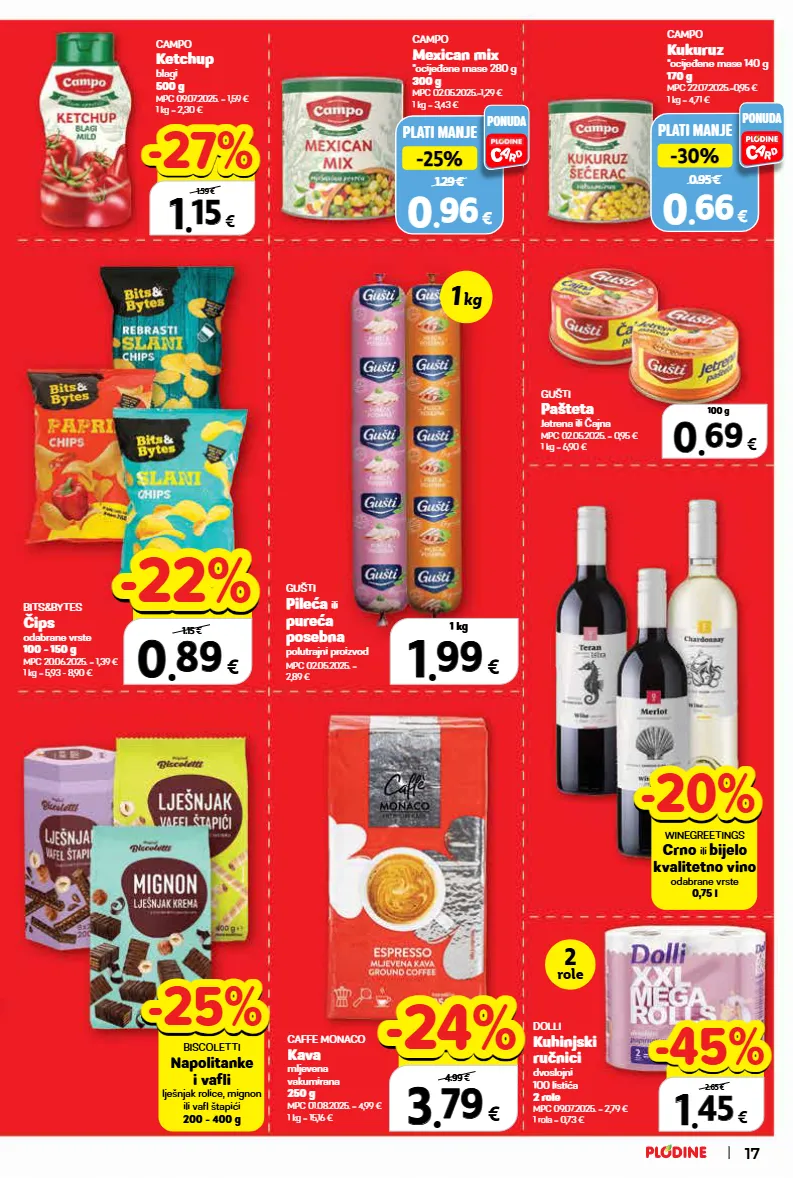dolli kuhinjski ručnici dvoslojni 100 listića 2 role mpc 09.07.2025. = 2,79 € 1 rola = 0,73 € campo ketchup blagi 500 g mpc 09.07.2025. = 1,59 € 1 kg = 2,30 € plati manje 0.95 € -30% -30% 0 0 . . 66 66 € ponuda campo kukuruz *ocijeđene mase 140 g 170 g mpc 22.07.2025.=0,95 € 1 kg = 4,71 € plati manje 1.29 € -25% -25% 0 0 . . 96 96 € ponuda campo mexican mix *ocijeđene mase 280 g 300 g mpc 02.05.2025.=1,29 € 1 kg = 3,43 € bits&bytes čips odabrane vrste 100 - 150 g mpc 20.06.2025. = 1,39 € 1 kg = 5,93 - 8,90 € gušti pašteta jetrena ili čajna mpc 02.05.2025. = 0,95 € 1 kg = 6,90 € gušti pileća ili pureća posebna polutrajni proizvod mpc 02.05.2025. = 2,89 € caffe monaco kava mljevena vakumirana 250 g mpc 01.08.2025. = 4,99 € 1 kg = 15,16 € 1 kg 2 role 17 winegreetings crno ili bijelo kvalitetno vino odabrane vrste 0,75 l -20% -20% biscoletti napolitanke i vafli lješnjak rolice, mignon ili vafl štapići 200 - 400 g -25% -25% 0 0 . . 69 69 € 100 g 1 1 . . 99 99 € 1 kg 0 0 . . 89 89 € xxxxx 1.15 € -22% -22% 1 1 . . 15 15 € xxxxx 1.59 € -27% -27% 1 1 . . 45 45 € xxxxx 2.65 € -45% -45% 3 3 . . 79 79 € xxxxx 4.99 € -24% -24%