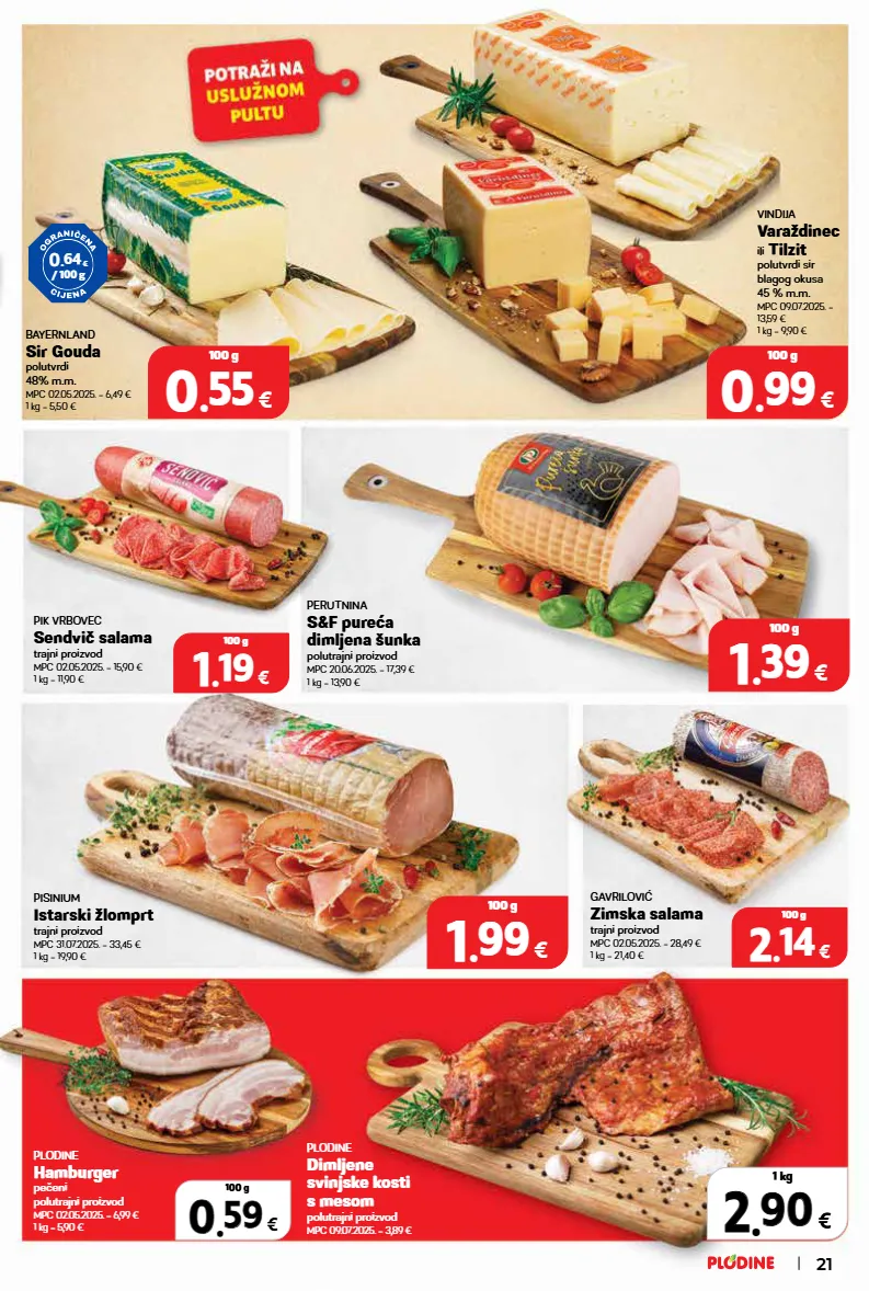 perutnina s&f pureća dimljena šunka polutrajni proizvod mpc 20.06.2025. = 17,39 € 1 kg = 13,90 € pisinium istarski žlomprt trajni proizvod mpc 31.07.2025. = 33,45 € 1 kg = 19,90 € gavrilović zimska salama trajni proizvod mpc 02.05.2025. = 28,49 € 1 kg = 21,40 € plodine dimljene svinjske kosti s mesom polutrajni proizvod mpc 09.07.2025. = 3,89 € pik vrbovec sendvič salama trajni proizvod mpc 02.05.2025. = 15,90 € 1 kg = 11,90 € plodine hamburger pečeni polutrajni proizvod mpc 02.05.2025. = 6,99 € 1 kg = 5,90 € 0 . 64 € / 100 g 0 0 . . 59 59 € 100 g 2 2 . . 90 90 € 1 kg 21 1 1 . . 19 19 € 100 g 2 2 . . 14 14 € 100 g bayernland sir gouda polutvrdi 48% m.m. mpc 02.05.2025. = 6,49 € 1 kg = 5,50 € vindija varaždinec ili tilzit polutvrdi sir blagog okusa 45 % m.m. mpc 09.07.2025. = 13,59 € 1 kg = 9,90 € 0 0 . . 99 99 € 100 g 0 0 . . 55 55 € 100 g 1 1 . . 39 39 € 100 g 1 1 . . 99 99 € 100 g