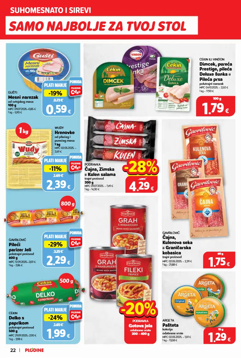 argeta pašteta kokošja odabrane vrste mpc 02.05.2025. = 1,59 € 1 kg = 13,58 € cekin ili vindon dimcek, pureća prestige, pileća deluxe šunka ili pileća prsa polutrajni narezak mpc 04.10.2025. = 2,50 € 1 kg = 17,90 € gavrilović čajna, kulenova seka ili graničarska kobasica trajni proizvod mpc 02.05.2025. = 2,39 € 1 kg = 21,88 € podravka čajna, zimska ili kulen salama trajni proizvod 300 g mpc 09.07.2025. = 7,49 € 1 kg = 14,30 € plati manje 2.69 € -11% -11% 2 2 . . 39 39 € ponuda wudy hrenovke od pilećeg i purećeg mesa 1 kg mpc 02.05.2025. = 2,69 € plati manje 2.65 € -24% -24% 1 1 . . 99 99 € ponuda cekin delko s paprikom polutrajni proizvod 500 g mpc 29.09.2025.=2,90 € 1 kg = 3,98 € plati manje 3.25 € -29% -29% 2 2 . . 29 29 € ponuda gavrilović pileći parizer jeli polutrajni proizvod 800 g mpc 12.09.2025.=3,59 € 1 kg = 2,86 € podravka gotova jela odabrane vrste 200 - 400 g -20% -20% plati manje 0.73 € -19% -19% 0 0 . . 59 59 € ponuda gušti mesni narezak od svinjskog mesa 100 g mpc 09.07.2025.=0,85 € 1 kg = 5,90 € samo najbolje za tvoj stol suhomesnato i sirevi 1 kg 800 g 500 g 22 1 1 . . 29 29 € 95 g 1 1 . . 75 75 € 80 g 4 4 . . 29 29 € 300 g 5.99 € -28% -28% 1 1 . . 79 79 € 100 g