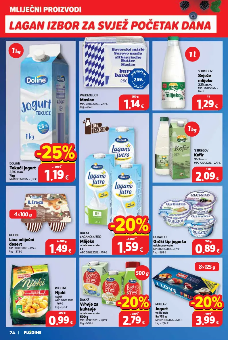 1 1 . . 29 29 € 1 l dukatos grčki tip jogurta odabrane vrste mpc 02.05.2025. = 1,19 € 1 kg = 5,93 € doline lina mliječni desert mpc 02.05.2025. = 1,99 € 1 kg = 3,73 € dukat vrhnje za kuhanje odabrane vrste 500 g mpc 02.06.2025. = 3,49 € 1 kg = 5,58 € ‘z bregov kefir 3,5% m.m. mpc 10.07.2025. = 2,79 € dukat lagano jutro mlijeko odabrane vrste 1 l mpc 02.05.2025. = 1,99 € doline tekući jogurt 2,8% m.m. 1 kg mpc 02.05.2025. = 1,59 € ‘z bregov svježe mlijeko 3,2% m.m. mpc 09.07.2025. = 1,65 € weideglück maslac mpc 02.05.2025. = 2,79 € 1 kg = 4,56 € 2 . 99 € plodine njoki svježi mpc 02.05.2025. = 1,69 € 1 kg = 1,65 € muller jogurt voćni mix 8x 125 g mpc 20.08.2025. = 5,17 € 1 kg = 3,99 € 1 l 500 g 1 kg 1 kg 4 x 100 g 8 x 125 g 24 1 1 . . 59 59 € 1 l 1.99 € -20% -20% 3 3 . . 99 99 € 1 l 4.99 € -20% -20% 2 2 . . 79 79 € 500 g 3.49 € -20% -20% 1 1 . . 19 19 € 1 kg 1.59 € -25% -25% 2 2 . . 09 09 € 1 kg 1 1 . . 14 14 € 250 g 0 0 . . 89 89 € 150 g 1 1 . . 49 49 € 4x 100 g 0 0 . . 99 99 € 600 g