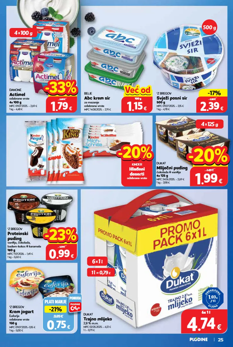 danone actimel odabrane vrste 4x 100 g mpc 09.07.2025. = 2,69 € 1 kg = 4,48 € ‘z bregov proteinski puding vanilija, čokolada, badem-kokos ili karamela 180 g mpc 11.01.2026. = 1,49 € 1 kg = 5,50 € dukat trajno mlijeko 2,8 % m.m. mpc 02.05.2025. = 6,12 € 1 l = 0,79 € dukat mliječni puding čokolada ili vanilija 4x 125 g mpc 24.06.2025. = 2,69 € 1 kg = 3,98 € belje abc krem sir za mazanje odabrane vrste mpc 14.08.2025. = 2,19 € ‘z bregov svježi posni sir 500 g mpc 09.07.2025. = 3,15 € 1 kg = 4,78 € 1 . 03 € / 1 l 500 g 4 x 100 g 4 x 125 g 6 x 1 l 1 l = 0,79 € 25 kinder hlađeni deserti odabrane vrste -20% -20% 1 1 . . 99 99 € 4x 125 g 2.49 € -20% -20% 1 1 . . 79 79 € 4x 100 g 2.69 € -33% -33% 2 2 . . 39 39 € 500 g -17% -17% 2.89 € 0 0 . . 99 99 € 180 g 1.29 € -23% -23% 4 4 . . 74 74 € 6x 1 l top cijena! već od hit cijena! 1 1 . . 15 15 € 100 g već od već od ‘z bregov krem jogurt euforija odabrane vrste 150 g mpc 09.07.2025.=1,05 € 1 kg = 5,00 € plati manje 0.95 € -21% -21% 0 0 . . 75 75 € ponuda