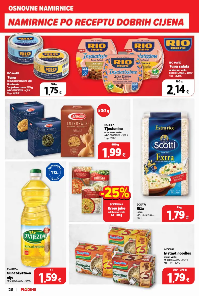 1 1 . . 79 79 € 350 - 375 g barilla tjestenina odabrane vrste mpc 09.07.2025. = 3,69 € 1 kg = 3,98 € rio mare tuna u suncokretovom ulju ili naturale *ocijeđene mase 120 g mpc 09.07.2025. = 4,19 € 1 kg = 14,58 € rio mare tuna salata odabrane vrste mpc 01.07.2025. = 4,89 € 1 kg = 13,38 € zvijezda suncokretovo ulje mpc 02.05.2025. = 1,69 € indomie instant noodles razne vrste mpc 09.06.2025. = 2,29 € 1 kg = 4,77 - 5,11 € 1 1 . . 79 79 € 1 kg scotti riža extra mpc 06.02.2026. = 1,99 € podravka krem juhe odabrane vrste 54 - 80 g -25% -25% 1 . 72 € 500 g 26 1 1 . . 59 59 € 1 l 1 1 . . 75 75 € 160 g 2 2 . . 14 14 € 160 g 1 1 . . 99 99 € 500 g