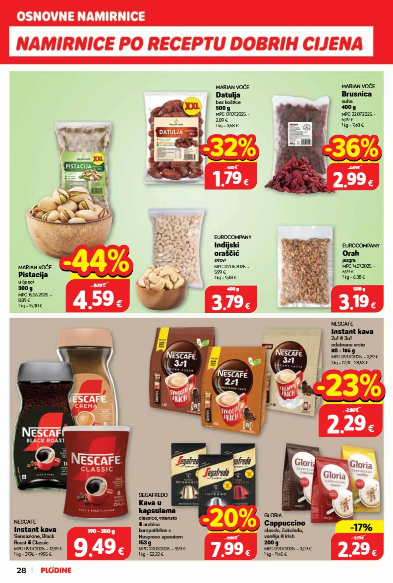 eurocompany orah jezgra mpc 14.07.2025. = 6,99 € 1 kg = 6,38 € eurocompany indijski oraščić sirovi mpc 02.05.2025. = 5,99 € 1 kg = 9,48 € marjan voće brusnica suha 400 g mpc 22.07.2025. = 5,09 € 1 kg = 7,48 € marjan voće pistacija u ljusci 300 g mpc 16.06.2025. = 8,89 € 1 kg = 15,30 € nescafe instant kava 2u1 ili 3u1 odabrane vrste 80 - 186 g mpc 09.07.2025. = 3,29 € 1 kg = 12,31 - 28,63 € nescafe instant kava sensazione, black roast ili classic mpc 09.07.2025. = 12,99 € 1 kg = 37,96 - 49,95 € marjan voće datulja bez koštice 500 g mpc 07.07.2025. = 2,89 € 1 kg = 3,58 € segafredo kava u kapsulama classico, intensto ili arabica kompatibilne s nespreso aparatom 153 g mpc 23.03.2026. = 9,99 € 1 kg = 52,22 € gloria cappuccino classic, čokolada, vanilija ili irish 200 g mpc 09.07.2025. = 3,09 € 1 kg = 11,45 € 28 2 2 . . 29 29 € 80 - 186 g 2.99 € -23% -23% 9 9 . . 49 49 € 190 - 250 g 3 3 . . 19 19 € 500 g 3 3 . . 79 79 € 400 g 4 4 . . 59 59 € 300 g 8.29 € -44% -44% 2 2 . . 99 99 € 400 g 4.69 € -36% -36% 1 1 . . 79 79 € 500 g 2.65 € -32% -32% 2 2 . . 29 29 € 200 g -17% -17% 2.79 € 7 7 . . 99 99 € 153 g 9.99 € -20% -20%