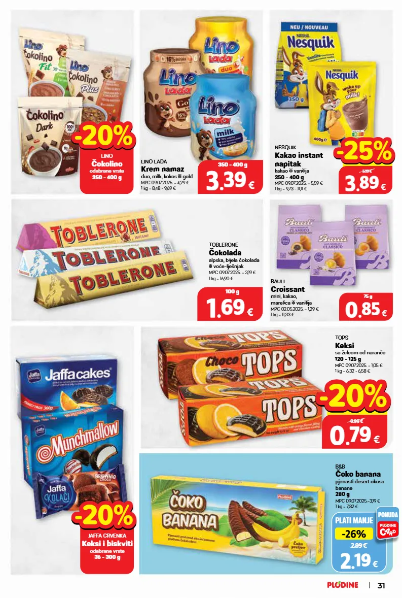 nesquik kakao instant napitak kakao ili vanilija 350 - 400 g mpc 09.07.2025. = 5,59 € 1 kg = 9,73 - 11,11 € toblerone čokolada alpska, bijela čokolada ili voće-lješnjak mpc 09.07.2025. = 3,19 € 1 kg = 16,90 € lino lada krem namaz duo, milk, kokos ili gold mpc 09.07.2025. = 4,29 € 1 kg = 8,48 - 9,69 € tops keksi sa želeom od naranče 120 - 125 g mpc 09.07.2025. = 1,05 € 1 kg = 6,32 - 6,58 € bauli croissant mini, kakao, marelica ili vanilija mpc 02.05.2025. = 1,29 € 1 kg = 11,33 € 31 jaffa crvenka keksi i biskviti odabrane vrste 36 - 300 g -20% -20% lino čokolino odabrane vrste 350 - 400 g -20% -20% 3 3 . . 39 39 € 350 - 400 g 3 3 . . 89 89 € 350 - 400 g 5.19 € -25% -25% 1 1 . . 69 69 € 100 g plati manje 2.99 € -26% -26% 2 2 . . 19 19 € ponuda b&b čoko banana pjenasti desert okusa banane 280 g mpc 09.07.2025.=3,19 € 1 kg = 7,82 € 0 0 . . 79 79 € 120 - 125 g 0.99 € -20% -20% 0 0 . . 85 85 € 75 g