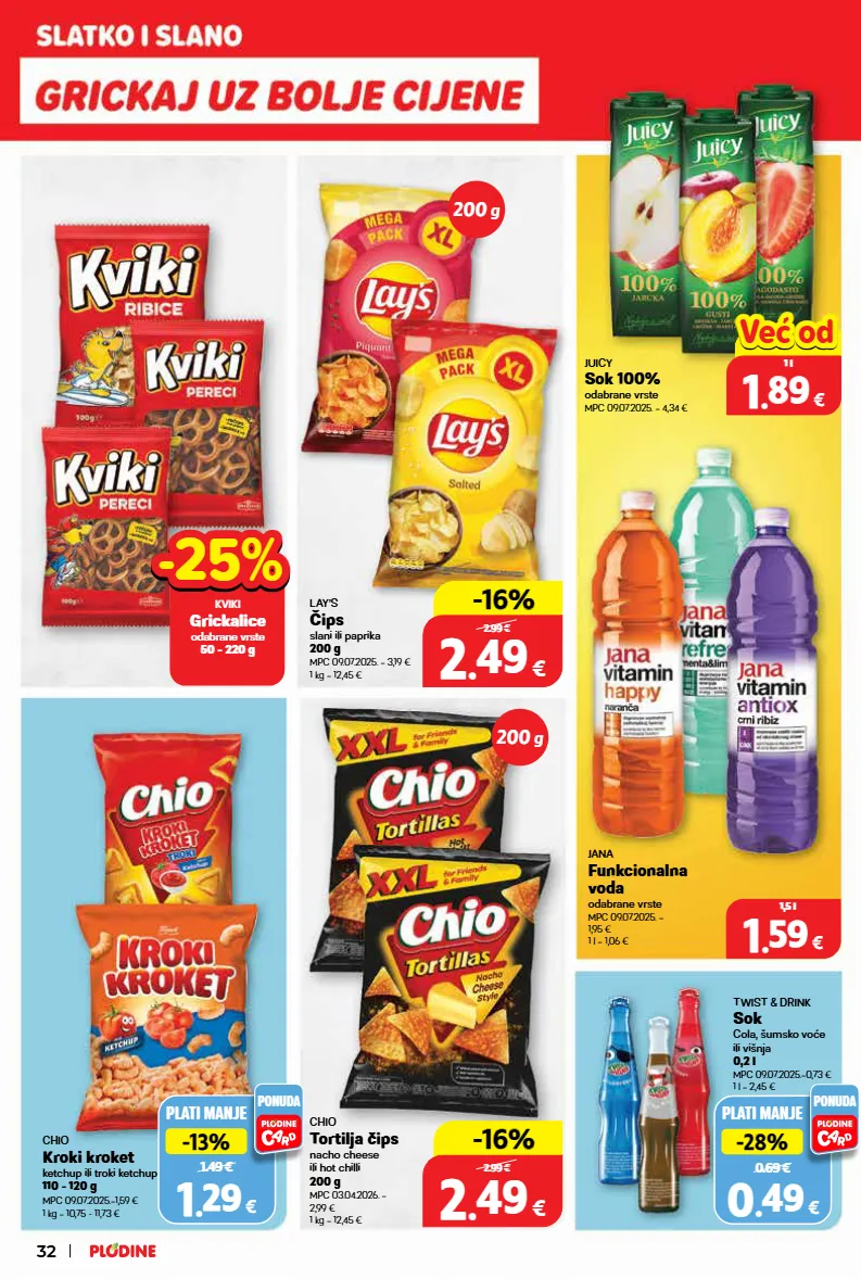 jana funkcionalna voda odabrane vrste mpc 09.07.2025. = 1,95 € 1 l = 1,06 € lay’s čips slani ili paprika 200 g mpc 09.07.2025. = 3,19 € 1 kg = 12,45 € juicy sok 100% odabrane vrste mpc 09.07.2025. = 4,34 € plati manje 0.69 € -28% -28% 0 0 . . 49 49 € ponuda twist & drink sok cola, šumsko voće ili višnja 0,2 l mpc 09.07.2025.=0,73 € 1 l = 2,45 € chio tortilja čips nacho cheese ili hot chilli 200 g mpc 03.04.2026. = 2,99 € 1 kg = 12,45 € 200 g 200 g 32 kviki grickalice odabrane vrste 50 - 220 g -25% -25% 2 2 . . 49 49 € 200 g -16% -16% 2.99 € 1 1 . . 59 59 € 1,5 l top cijena! već od hit cijena! 1 1 . . 89 89 € 1 l već od već od plati manje 1.49 € -13% -13% 1 1 . . 29 29 € ponuda chio kroki kroket ketchup ili troki ketchup 110 - 120 g mpc 09.07.2025.=1,59 € 1 kg = 10,75 - 11,73 € 2 2 . . 49 49 € 200 g -16% -16% 2.99 €