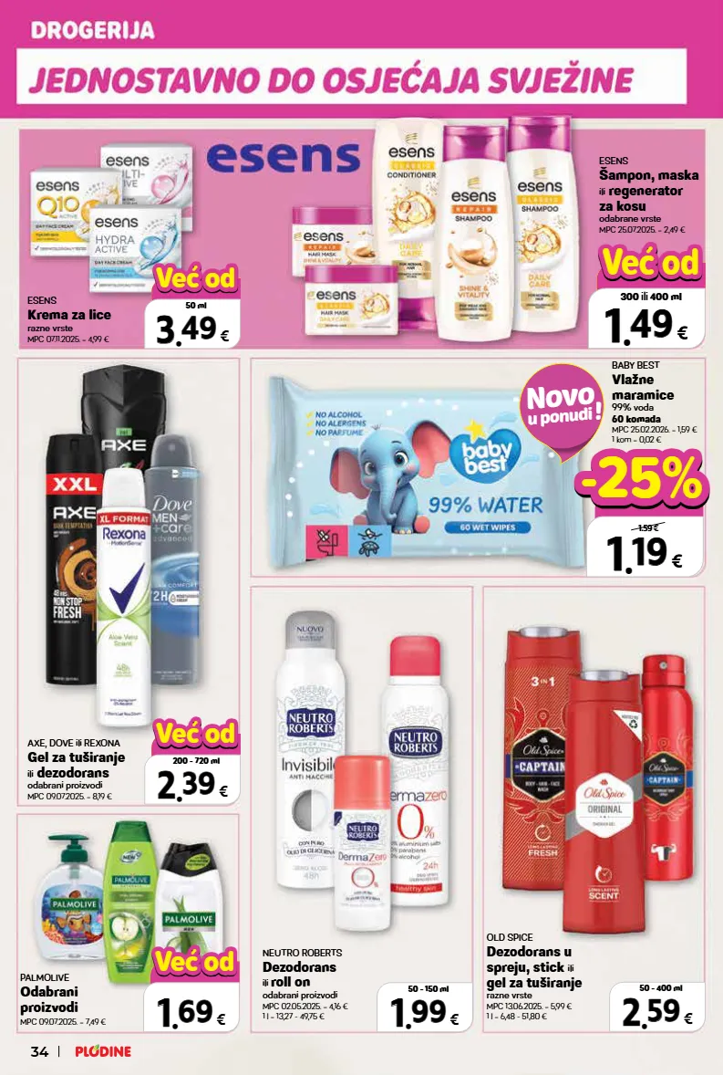 neutro roberts dezodorans ili roll on odabrani proizvodi mpc 02.05.2025. = 4,16 € 1 l = 13,27 - 49,75 € baby best vlažne maramice 99% voda 60 komada mpc 25.02.2026. = 1,59 € 1 kom = 0,02 € old spice dezodorans u spreju, stick ili gel za tuširanje razne vrste mpc 13.06.2025. = 5,99 € 1 l = 6,48 - 51,80 € palmolive odabrani proizvodi mpc 09.07.2025. = 7,49 € esens šampon, maska ili regenerator za kosu odabrane vrste mpc 25.07.2025. = 2,49 € esens krema za lice razne vrste mpc 07.11.2025. = 4,99 € axe, dove ili rexona gel za tuširanje ili dezodorans odabrani proizvodi mpc 09.07.2025. = 8,19 € novo u ponudi ! 34 top cijena! već od hit cijena! 3 3 . . 49 49 € 50 ml već od već od top cijena! već od hit cijena! 2 2 . . 39 39 € 200 - 720 ml već od već od top cijena! već od hit cijena! 1 1 . . 49 49 € 300 ili 400 ml već od već od 2 2 . . 59 59 € 50 - 400 ml top cijena! već od hit cijena! 1 1 . . 69 69 € već od već od 1 1 . . 19 19 € 60 komada 1.59 € -25% -25% 1 1 . . 99 99 € 50 - 150 ml