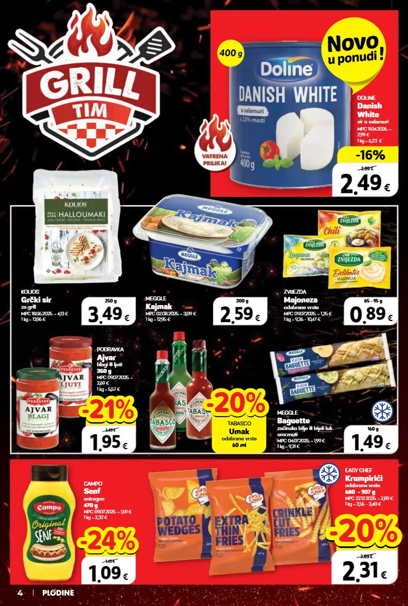 meggle baguette začinsko bilje ili bijeli luk smrznuti mpc 04.07.2025. = 1,99 € 1 kg = 9,31 € easy chef krumpirići odabrane vrste 680 - 907 g mpc 22.12.2025. = 2,89 € 1 kg = 2,55 - 3,40 € meggle kajmak mpc 02.08.2025. = 3,09 € 1 kg = 12,95 € zvijezda majoneza odabrane vrste mpc 09.07.2025. = 1,25 € 1 kg = 9,36 - 10,47 € campo senf estragon 470 g mpc 09.07.2025. = 1,59 € 1 kg = 2,32 € podravka ajvar blagi ili ljuti 350 g mpc 09.07.2025. = 2,69 € 1 kg = 5,57 € kolios grčki sir za grill mpc 18.06.2025. = 4,13 € 1 kg = 13,96 € doline danish white sir u salamuri mpc 11.04.2026. = 2,99 € 1 kg = 6,23 € 2 2 . . 59 59 € 200 g 3 3 . . 49 49 € 250 g 2 2 . . 31 31 € xxxxx 2.89 € -20% -20% 1 1 . . 09 09 € xxxxx 1.45 € -24% -24% 400 g novo u ponudi ! 4 tabasco umak odabrane vrste 60 ml -20% -20% 1 1 . . 95 95 € xxxxx 2.49 € -21% -21% 1 1 . . 49 49 € 160 g 0 0 . . 89 89 € 85 - 95 g 2 2 . . 49 49 € 400 g -16% -16% 2.99 €