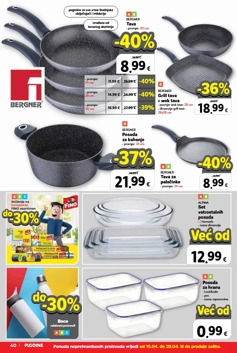 -40% 14.99 € 24.99 € • promjer: 28 cm -39% 16.99 € 27.99 € • promjer: 30 cm -40% 11.99 € 19.99 € • promjer: 24 cm 8 8 . . 99 99 € 14.99 € -40% -40% izrađeno od kovanog aluminija pogodno za sve vrste štednjaka uključujući i indukciju a b c alpina set vatrostalnih posuda • 3 komada • razne dimenzije a b bergner grill tava ili wok tava • promjer wok tave: 28 cm • dimenzije grill tave: 28x28 cm a bergner posuda za kuhanje • promjer: 24 cm a bergner tava za palačinke • promjer: 24 cm a b bergner tava • promjer: 20 cm a b 8 8 . . 99 99 € 14.99 € -40% -40% 18 18 . . 99 99 € 29.99 € -36% -36% 21 21 . . 99 99 € 34.99 € -37% -37% top cijena! već od hit cijena! 12 12 . . 99 99 € već od već od -30% -30% do do 0 0 . . 99 99 € već od već od do do boce odabrani proizvodi -30% -30% a b c posuda za hranu • lock&safe • pvc • razne zapremnine a b ponuda neprehrambenih proizvoda vrijedi od 15.04. do 28.04. ili do prodaje zaliha. 40
