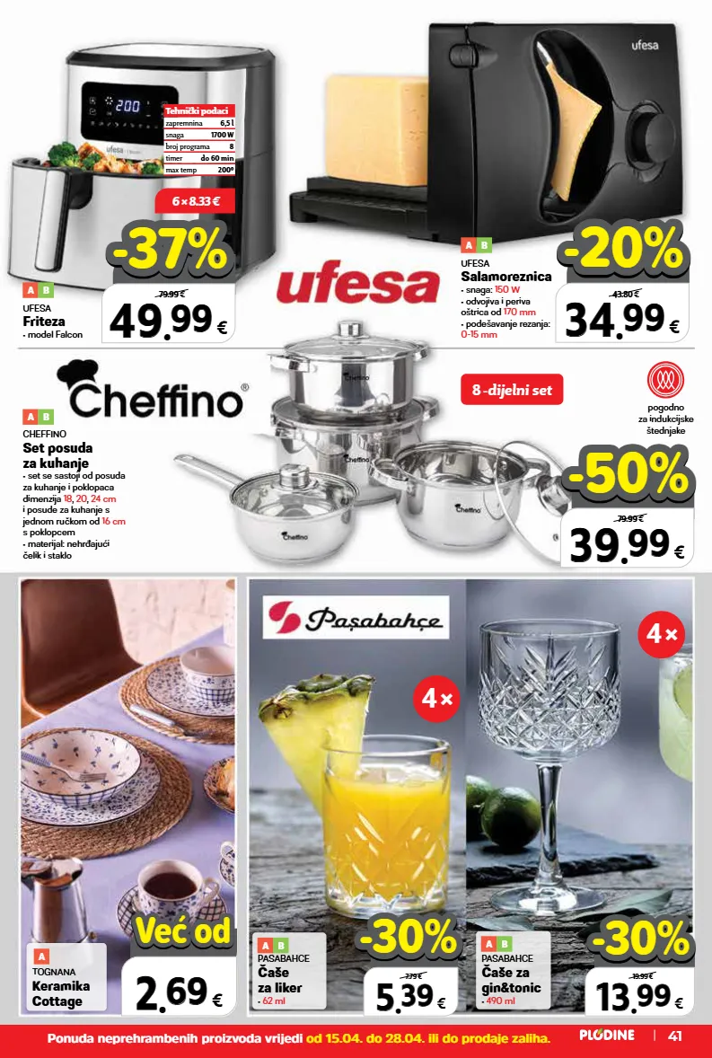 tehnički podaci zapremnina 6,5 l snaga 1700 w broj programa 8 timer do 60 min max temp 2000 8 - dijelni set pogodno za indukcijske štednjake 4 × 4 × 34 34 . . 99 99 € 43.80 € -20% -20% 49 49 . . 99 99 € 6,5 l 79.99 € -37% -37% ufesa friteza • model falcon a b ufesa salamoreznica • snaga: 150 w • odvojiva i periva oštrica od 170 mm • podešavanje rezanja: 0-15 mm a b cheffino set posuda za kuhanje • set se sastoji od posuda za kuhanje i poklopaca dimenzija 18, 20, 24 cm i posude za kuhanje s jednom ručkom od 16 cm s poklopcem • materijal: nehrđajući čelik i staklo a b 13 13 . . 99 99 € 19.99 € -30% -30% 5 5 . . 39 39 € 7.79 € -30% -30% pasabahce čaše za liker • 62 ml a b pasabahce čaše za gin&tonic • 490 ml a b 6 × 8.33 € 39 39 . . 99 99 € 79.99 € -50% -50% tognana keramika cottage a 2 2 . . 69 69 € već od već od ponuda neprehrambenih proizvoda vrijedi od 15.04. do 28.04. ili do prodaje zaliha. 41