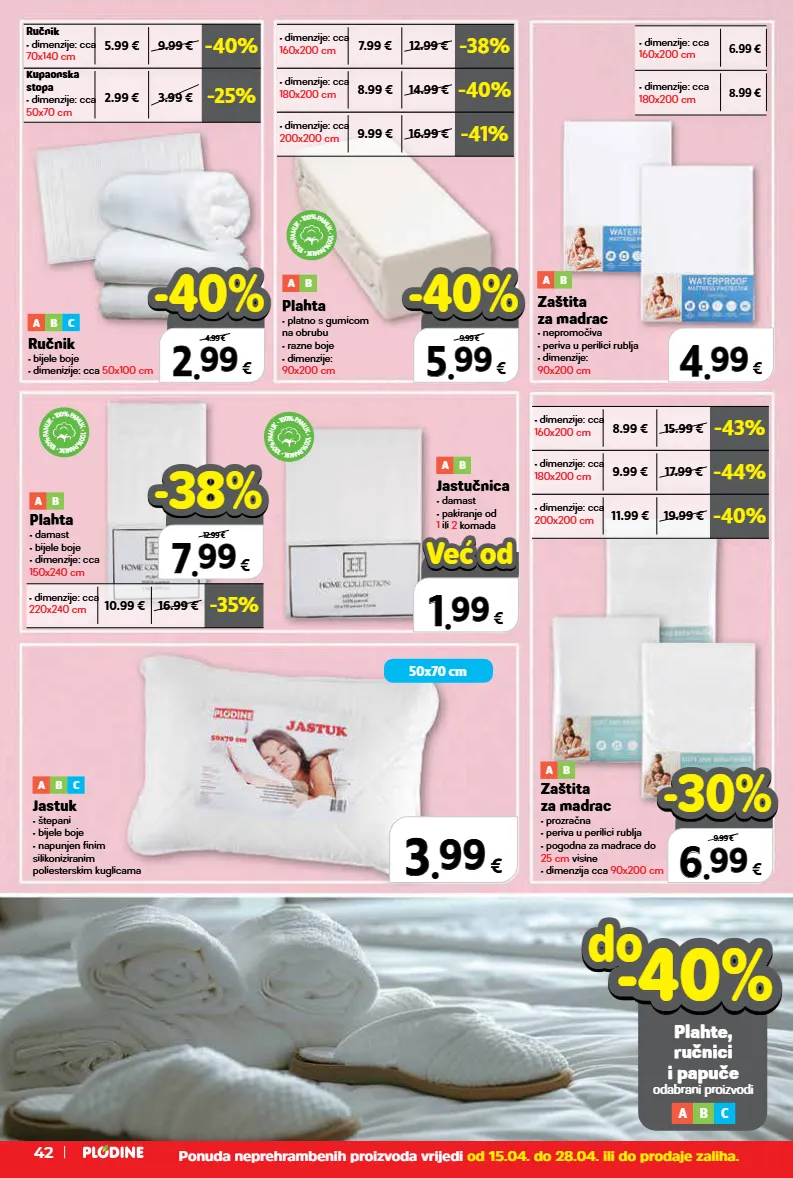 • dimenzije: cca 160x200 cm 6.99 € • dimenzije: cca 180x200 cm 8.99 € -25% 2.99 € 3.99 € kupaonska stopa • dimenzije: cca 50x70 cm -40% 5.99 € 9.99 € ručnik • dimenzije: cca 70x140 cm -35% 10.99 € 16.99 € • dimenzije: cca 220x240 cm -38% 7.99 € 12.99 € • dimenzije: cca 160x200 cm -40% 8.99 € 14.99 € • dimenzije: cca 180x200 cm -41% 9.99 € 16.99 € • dimenzije: cca 200x200 cm -43% 8.99 € 15.99 € • dimenzije: cca 160x200 cm -44% 9.99 € 17.99 € • dimenzije: cca 180x200 cm -40% 11.99 € 19.99 € • dimenzije: cca 200x200 cm • 1 0 0 % p a m u k • 1 0 0 % p a m u k • 1 0 0 % p a m u k • 1 0 0 % p a m u k • 1 0 0 % p a m u k • 1 0 0 % p a m u k • 1 0 0 % p a m u k • 1 0 0 % p a m u k • 1 0 0 % p a m u k 50x70 cm 2 2 . . 99 99 € 4.99 € -40% -40% 5 5 . . 99 99 € 9.99 € -40% -40% 7 7 . . 99 99 € 12.99 € -38% -38% 6 6 . . 99 99 € 9.99 € -30% -30% do do plahte, ručnici i papuče odabrani proizvodi -40% -40% a b c ručnik • bijele boje • dimenizije: cca 50x100 cm a b c zaštita za madrac • nepromočiva • periva u perilici rublja • dimenzije: 90x200 cm a b zaštita za madrac • prozračna • periva u perilici rublja • pogodna za madrace do 25 cm visine • dimenzija cca 90x200 cm a b jastučnica • damast • pakiranje od 1 ili 2 komada a b plahta • damast • bijele boje • dimenzije: cca 150x240 cm a b plahta • platno s gumicom na obrubu • razne boje • dimenzije: 90x200 cm a b jastuk • štepani • bijele boje • napunjen finim silikoniziranim poliesterskim kuglicama a b c 3 3 . . 99 99 € 4 4 . . 99 99 € 1 1 . . 99 99 € već od već od ponuda neprehrambenih proizvoda vrijedi od 15.04. do 28.04. ili do prodaje zaliha. 42