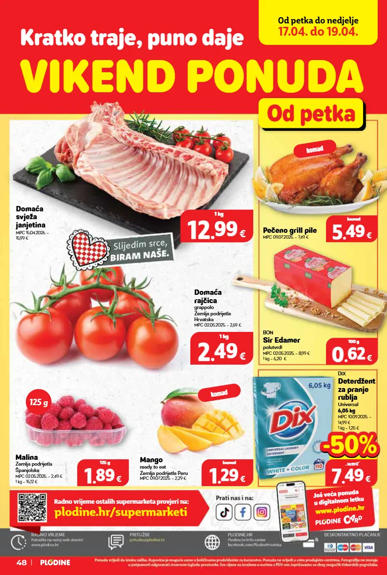bon sir edamer polutvrdi mpc 02.05.2025. = 8,99 € 1 kg = 6,20 € pečeno grill pile mpc 09.07.2025. = 7,49 € dix deterdžent za pranje rublja universal 6,05 kg mpc 10.09.2025. = 14,99 € 1 kg = 1,25 € od petka do nedjelje 17.04. do 19.04. vikend ponuda od petka kratko traje, puno daje domaća rajčica grappolo zemlja podrijetla hrvatska mpc 02.05.2025. = 2,69 € domaća svježa janjetina mpc 15.04.2026. = 15,99 € 12 12 . . 99 99 € 1 kg 2 2 . . 49 49 € 1 kg malina zemlja podrijetla španjolska mpc 02.05.2025. = 2,49 € 1 kg = 15,12 € mango ready to eat zemlja podrijetla peru mpc 09.07.2025. = 2,29 € 1 1 . . 29 29 € komad 1 1 . . 89 89 € 125 g još veća ponuda u digitalnom letku www.plodine.hr radno vrijeme ostalih supermarketa provjeri na: plodine.hr/supermarketi 125 g komad komad 48 5 5 . . 49 49 € komad 7 7 . . 49 49 € 6,05 kg 14.99 € -50% -50% 0 0 . . 62 62 € 100 g