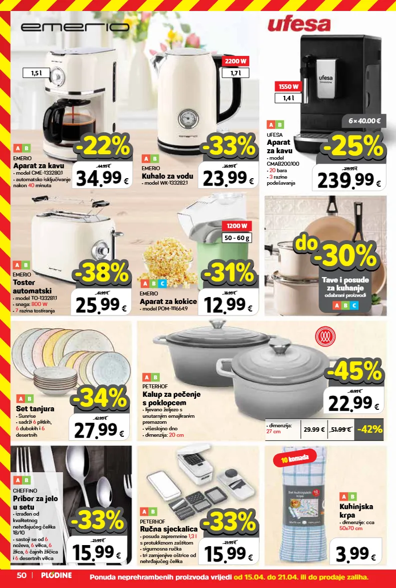 15 15 . . 99 99 € 23.99 € -33% -33% 15 15 . . 99 99 € 23.99 € -33% -33% cheffino pribor za jelo u setu • izrađen od kvalitetnog nehrđajućeg čelika 18/10 • sastoji se od 6 noževa, 6 vilica, 6 žlica, 6 čajnih žličica i 6 desertnih vilica a b emerio kuhalo za vodu • model wk-133282.1 a b ufesa aparat za kavu • model cmab200.100 • 20 bara • 3 razine podešavanja a b emerio aparat za kavu • model cme-133280.1 • automatsko isključivanje nakon 40 minuta a b emerio toster automatski • model to-133281.1 • snaga: 800 w • 7 razina tostiranja emerio aparat za kokice • model pom-111664.9 peterhof ručna sjeckalica • posuda zapremnine 1,3 l s protukliznom zaštitom • sigurnosna ručka • tri zamjenjive oštrice od nehrđajučeg čelika a b kuhinjska krpa • dimenzije: cca 50x70 cm a b do do tave i posude za kuhanje odabrani proizvodi -30% -30% a b c 3 3 . . 99 99 € 22 22 . . 99 99 € 41.99 € -45% -45% -42% 29.99 € 51.99 € • dimenzija: 27 cm set tanjura • sunrise • sadrži 6 plitkih, 6 dubokih i 6 desertnih a b peterhof kalup za pečenje s poklopcem • lijevano željezo s unutarnjim emajliranim premazom • višeslojno dno • dimenzija: 20 cm a b 27 27 . . 99 99 € 42.99 € -34% -34% 34 34 . . 99 99 € 44.99 € -22% -22% 23 23 . . 99 99 € 35.99 € -33% -33% 12 12 . . 99 99 € 18.99 € -31% -31% 25 25 . . 99 99 € 41.99 € -38% -38% 239 239 . . 99 99 € 319.99 € 6 × 40.00 € -25% -25% a b c a b 1550 w 1,4 l 1200 w 50 - 60 g 2200 w 1,7 l 1,5 l 10 komada ponuda neprehrambenih proizvoda vrijedi od 15.04. do 21.04. ili do prodaje zaliha. 50