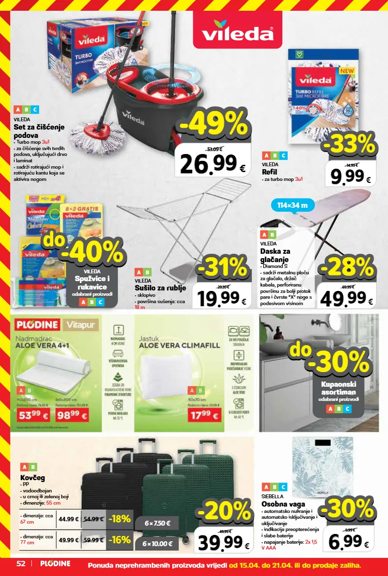 6 6 . . 99 99 € 9.99 € -30% -30% do do kupaonski asortiman odabrani proizvodi -30% -30% a b c siebella osobna vaga • automatsko nuliranje i automatsko isključivanje i uključivanje • indikacija preopterećenja i slabe baterije • napajanje baterije: 2x 1,5 v aaa a b c 26 26 . . 99 99 € 53.09 € -49% -49% do do vileda spužvice i rukavice odabrani proizvodi -40% -40% 9 9 . . 99 99 € 14.99 € -33% -33% 19 19 . . 99 99 € 29.20 € -31% -31% 49 49 . . 99 99 € 69.99 € -28% -28% vileda set za čišćenje podova • turbo mop 3u1 • za čišćenje svih tvrdih podova, uključujući drvo i laminat • sadrži rotirajući mop i rotirajuću kantu koja se aktivira nogom a b c vileda refil • za turbo mop 3u1 a b c vileda sušilo za rublje • sklopivo • površina sušenja: cca 18 m a b vileda daska za glačanje • diamond s • sadrži metalnu ploču za glačalo, držač kabela, perforiranu površinu za bolji protok pare i čvrste “x” noge s podesivom visinom a b kovčeg • pp • vodoodbojan • u crnoj ili zelenoj boji • dimenzije: 55 cm a b -18% 44.99 € 54.99 € • dimenzije: cca 67 cm -16% 49.99 € 59.99 € • dimenzije: cca 77 cm 39 39 . . 99 99 € xxxxx 49.99 € -20% -20% 6 × 7.50 € 6 × 10.00 € a b c 114×34 m ponuda neprehrambenih proizvoda vrijedi od 15.04. do 21.04. ili do prodaje zaliha. 52