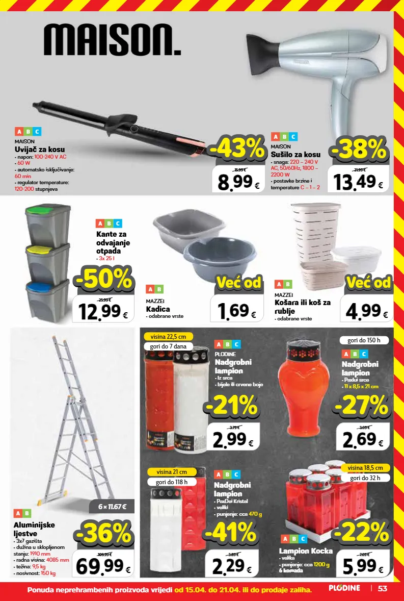 nadgrobni lampion • paxdei kristal • veliki • punjenje: cca 470 g lampion kocka • velika • punjenje: cca 1200 g 6 komada nadgrobni lampion • paxlui srce • 11 x 8,5 x 21 cm plodine nadgrobni lampion • iz srca • bijele ili crvene boje visina 21 cm gori do 118 h visina 18,5 cm gori do 32 h visina 22,5 cm gori do 7 dana gori do 150 h 69 69 . . 99 99 € 109.99 € -36% -36% kante za odvajanje otpada • 3x 25 l 12 12 . . 99 99 € 25.99 € -50% -50% 2 2 . . 29 29 € komad 3.89 € -41% -41% 5 5 . . 99 99 € 6 komada 7.69 € -22% -22% 2 2 . . 69 69 € komad 3.69 € -27% -27% 2 2 . . 99 99 € 3.79 € -21% -21% 6 × 11.67 € 8 8 . . 99 99 € 15.99 € -43% -43% 13 13 . . 49 49 € 21.99 € -38% -38% maison uvijač za kosu • napon: 100-240 v ac • 60 w • automatsko isključivanje: 60 min • regulator temperature: 120-200 stupnjeva a b c maison sušilo za kosu • snaga: 220 – 240 v ac, 50/60hz‚ 1800 – 2200 w • postavke brzine i temperature c – 1 – 2 a b c a b c a b c a b c a b c a b c aluminijske ljestve • 3x7 gazišta • dužina u sklopljenom stanju: 1910 mm • radna visina: 4085 mm • težina: 9,5 kg • nosivnost: 150 kg a b 1 1 . . 69 69 € već od već od 4 4 . . 99 99 € već od već od mazzei kadica • odabrane vrste a b mazzei košara ili koš za rublje • odabrane vrste a b ponuda neprehrambenih proizvoda vrijedi od 15.04. do 21.04. ili do prodaje zaliha. 53