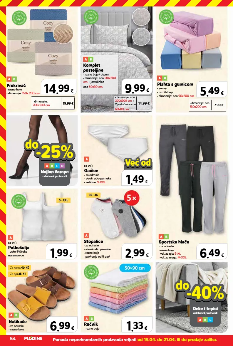 1 1 . . 33 33 € ručnik • razne boje a b natikače • za odrasle • razne boje a b 6 6 . . 99 99 € a b sportske hlače • za odrasle • razne boje • vel. za nju: s-xl • vel. za njega: m-xxl 1 1 . . 49 49 € već od već od 6 6 . . 49 49 € 2 2 . . 99 99 € stopalice • za odrasle • visoki udio pamuka • razne boje • pakiranje od 5 pari a dević gaćice • za odrasle • visoki udio pamuka • veličine: s-xxl a 9 9 . . 99 99 € komplet posteljine • razne boje i dezeni • dimenzije: cca 140x200 cm + jastučnica cca 60x80 cm a b plahta s gumicom • jersey • raznih boja • dimenzije: cca 90x200 cm a b prekrivač • razne boje • dimenzije: 150x 200 cm a b do do najlon čarape odabrani proizvodi -25% -25% a b c d dević potkošulja • uske ili široke naramenice a • dimenzije: 200x240 cm 19.99 € 14 14 . . 99 99 € 14.99 € • dimenzije: cca 200x200 cm + 2 jastučnice cca 60x80 cm 7.99 € • dimenzije: cca 180x200 cm 1 1 . . 99 99 € 5 5 . . 49 49 € xxxxx do do deke i tepisi odabrani proizvodi -40% -40% a b c za nju 36-41 za njega 40-45 ponuda neprehrambenih proizvoda vrijedi od 15.04. do 21.04. ili do prodaje zaliha. 54