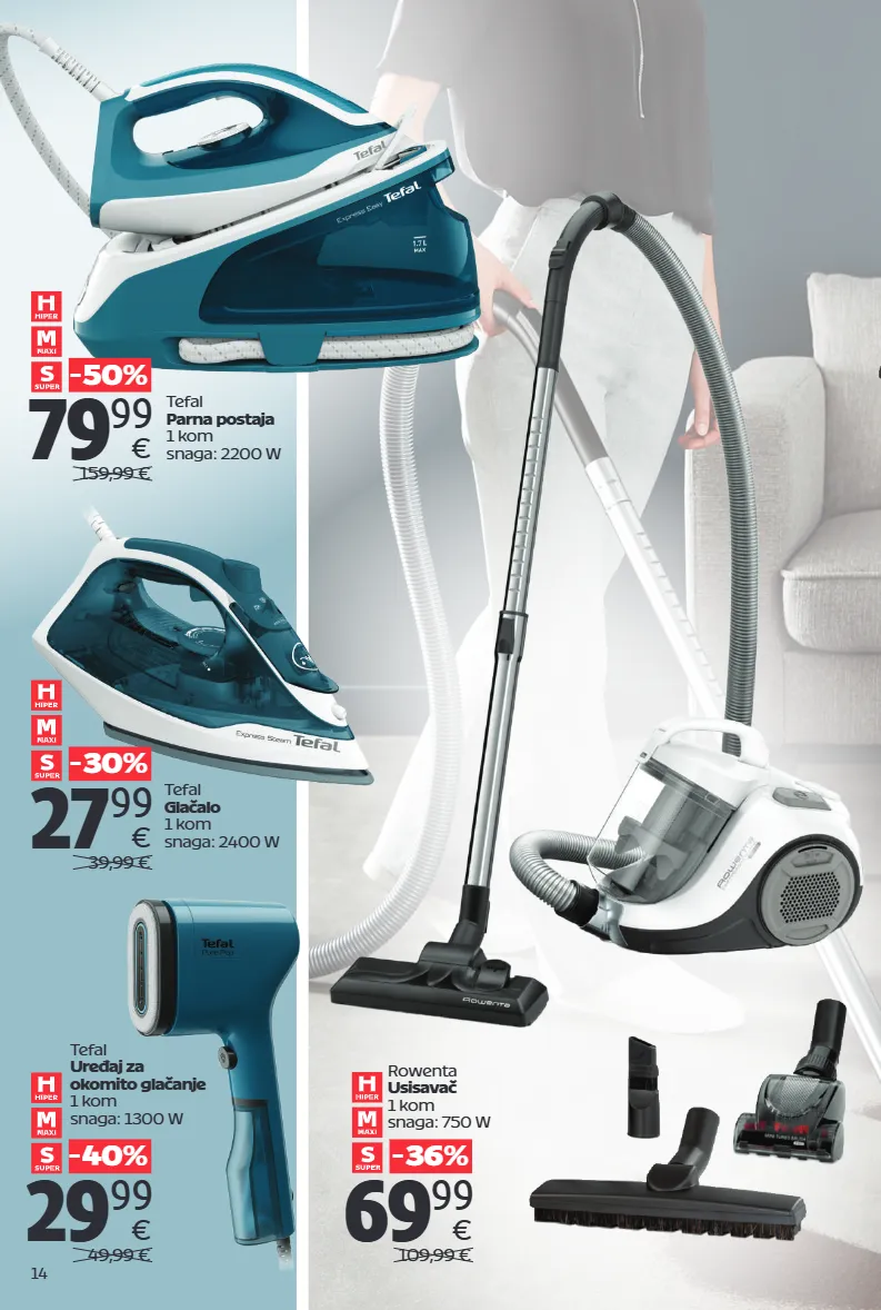 - 30 % 27 99 € tefal glačalo 1 kom snaga: 2400 w 39,99 € - 40 % 29 99 € tefal uređaj za okomito glačanje 1 kom snaga: 1300 w 49,99 € - 36 % 69 99 € rowenta usisavač 1 kom snaga: 750 w 109,99 € 14 - 50 % 79 99 € tefal parna postaja 1 kom snaga: 2200 w 159,99 €