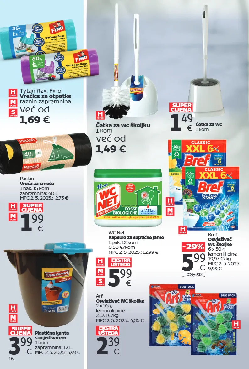super cijena 3 99 € pronto sredstvo za čišćenje 500 ml višenamjensko ili za drvene površine 7,98 €/l mpc 2. 5. 2025.: 5,99 € 0 75 € domax solna kiselina 1 l mpc 2. 5. 2025.: 0,99 € super cijena 1 59 € sanitar sredstvo za čišćenje i dezinfekciju 750 ml razne vrste 2,12 €/l mpc 2. 5. 2025.: 2,49 € ili 2,29 € 20 - 20 % 3 19 € teta violeta sredstvo za čišćenje podova, 1 l + sredstvo za čišćenje stakla, 750 ml 1 pak 1,83 €/l mpc 19. 3. 2026.: 3,99 € 3,99 € super cijena 2 99 € domestos sredstvo za čišćenje 1250 ml pine ili citrus 2,40 €/l mpc 2. 5. 2025.: 4,49 € ili 4,29 € - 30 % * airwick osvježivač zraka super cijena 1 59 € arf vlažne maramice za čišćenje i dezinfekciju 40 kom deziclean 0,04 €/kom mpc 2. 5. 2025.: 2,25 €
