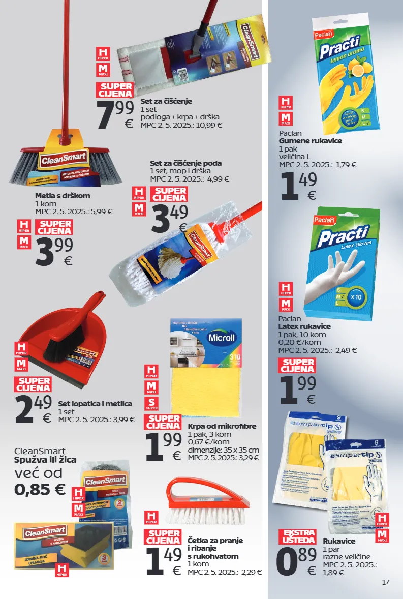 ekstra ušteda 0 89 € rukavice 1 par razne veličine mpc 2. 5. 2025.: 1,89 € 1 49 € paclan gumene rukavice 1 pak veličina l mpc 2. 5. 2025.: 1,79 € super cijena 1 99 € krpa od mikrofibre 1 pak, 3 kom 0,67 €/kom dimenzije: 35 x 35 cm mpc 2. 5. 2025.: 3,29 € super cijena 1 99 € paclan latex rukavice 1 pak, 10 kom 0,20 €/kom mpc 2. 5. 2025.: 2,49 € super cijena 7 99 € set za čišćenje 1 set podloga + krpa + drška mpc 2. 5. 2025.: 10,99 € super cijena 2 49 € set lopatica i metlica 1 set mpc 2. 5. 2025.: 3,99 € super cijena 3 49 € set za čišćenje poda 1 set, mop i drška mpc 2. 5. 2025.: 4,99 € super cijena 3 99 € metla s drškom 1 kom mpc 2. 5. 2025.: 5,99 € 17 super cijena 1 49 € četka za pranje i ribanje s rukohvatom 1 kom mpc 2. 5. 2025.: 2,29 € već od 0,85 € cleansmart spužva ili žica