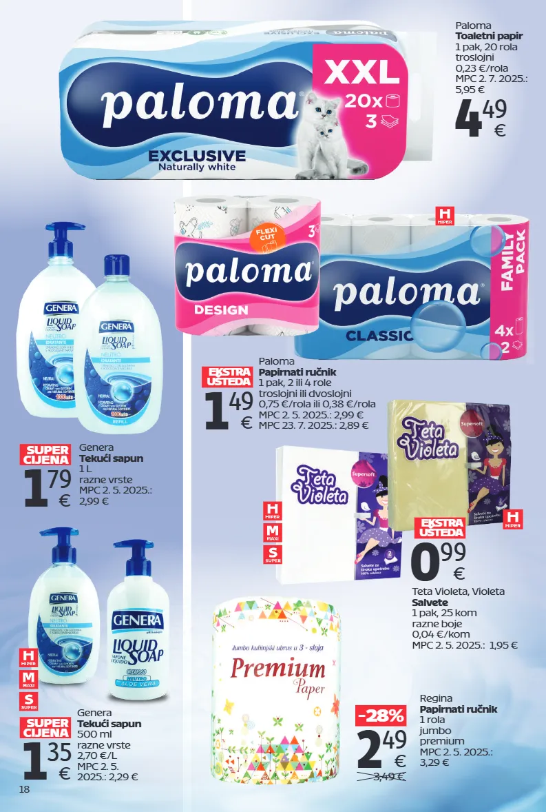ekstra ušteda 0 99 € teta violeta, violeta salvete 1 pak, 25 kom razne boje 0,04 €/kom mpc 2. 5. 2025.: 1,95 € ekstra ušteda 1 49 € paloma papirnati ručnik 1 pak, 2 ili 4 role troslojni ili dvoslojni 0,75 €/rola ili 0,38 €/rola mpc 2. 5. 2025.: 2,99 € mpc 23. 7. 2025.: 2,89 € 4 49 € paloma toaletni papir 1 pak, 20 rola troslojni 0,23 €/rola mpc 2. 7. 2025.: 5,95 € - 28 % 2 49 € regina papirnati ručnik 1 rola jumbo premium mpc 2. 5. 2025.: 3,29 € 3,49 € super cijena 1 79 € genera tekući sapun 1 l razne vrste mpc 2. 5. 2025.: 2,99 € 18 super cijena 1 35 € genera tekući sapun 500 ml razne vrste 2,70 €/l mpc 2. 5. 2025.: 2,29 €