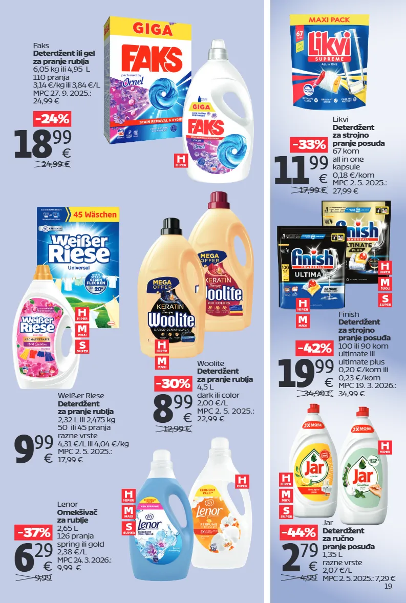 - 24 % 18 99 € faks deterdžent ili gel za pranje rublja 6,05 kg ili 4,95 l 110 pranja 3,14 €/kg ili 3,84 €/l mpc 27. 9. 2025.: 24,99 € 24,99 € - 33 % 11 99 € likvi deterdžent za strojno pranje posuđa 67 kom all in one kapsule 0,18 €/kom mpc 2. 5. 2025.: 27,99 € 17,99 € 9 99 € weißer riese deterdžent za pranje rublja 2,32 l ili 2,475 kg 50 ili 45 pranja razne vrste 4,31 €/l ili 4,04 €/kg mpc 2. 5. 2025.: 17,99 € - 30 % 8 99 € woolite deterdžent za pranje rublja 4,5 l dark ili color 2,00 €/l mpc 2. 5. 2025.: 22,99 € 12,99 € 19 - 37 % 6 29 € lenor omekšivač za rublje 2,65 l 126 pranja spring ili gold 2,38 €/l mpc 24. 3. 2026.: 9,99 € 9,99 - 42 % 19 99 € finish deterdžent za strojno pranje posuđa 100 ili 90 kom ultimate ili ultimate plus 0,20 €/kom ili 0,23 €/kom mpc 19. 3. 2026.: 34,99 € 34,99 € - 44 % 2 79 € jar deterdžent za ručno pranje posuđa 1,35 l razne vrste 2,07 €/l mpc 2. 5. 2025.: 7,29 € 4,99