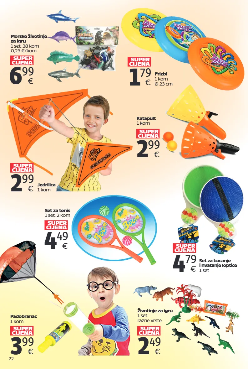 super cijena 4 79 € Set za bacanje i hvatanje loptice 1 set super cijena 2 99 € Katapult 1 kom super cijena 1 79 € Frizbi 1 kom Ø 23 cm 22 super cijena 2 99 € Jedrilica 1 kom super cijena 4 49 € Set za tenis 1 set, 2 kom super cijena 3 99 € Padobranac 1 kom super cijena 2 49 € Životinje za igru 1 set razne vrste super cijena 6 99 € Morske životinje za igru 1 set, 28 kom 0,25 €/kom