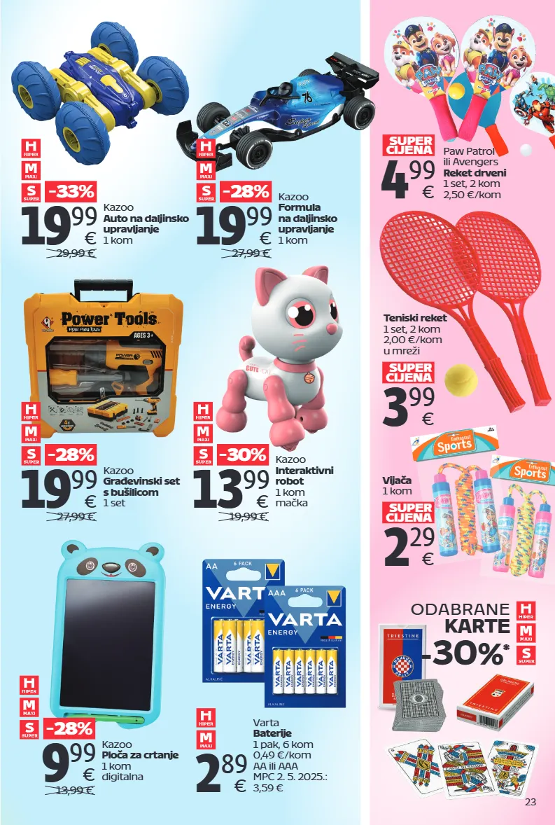 - 33 % 19 99 € kazoo auto na daljinsko upravljanje 1 kom 29,99 € - 28 % 19 99 € kazoo formula na daljinsko upravljanje 1 kom 27,99 € - 30 % 13 99 € kazoo interaktivni robot 1 kom mačka 19,99 € - 28 % 19 99 € kazoo građevinski set s bušilicom 1 set 27,99 € 2 89 € varta baterije 1 pak, 6 kom 0,49 €/kom aa ili aaa mpc 2. 5. 2025.: 3,59 € super cijena 3 99 € teniski reket 1 set, 2 kom 2,00 €/kom u mreži super cijena 4 99 € paw patrol ili avengers reket drveni 1 set, 2 kom 2,50 €/kom super cijena 2 29 € vijača 1 kom - 30 % * odabrane karte 23 - 28 % 9 99 € kazoo ploča za crtanje 1 kom digitalna 13,99 €