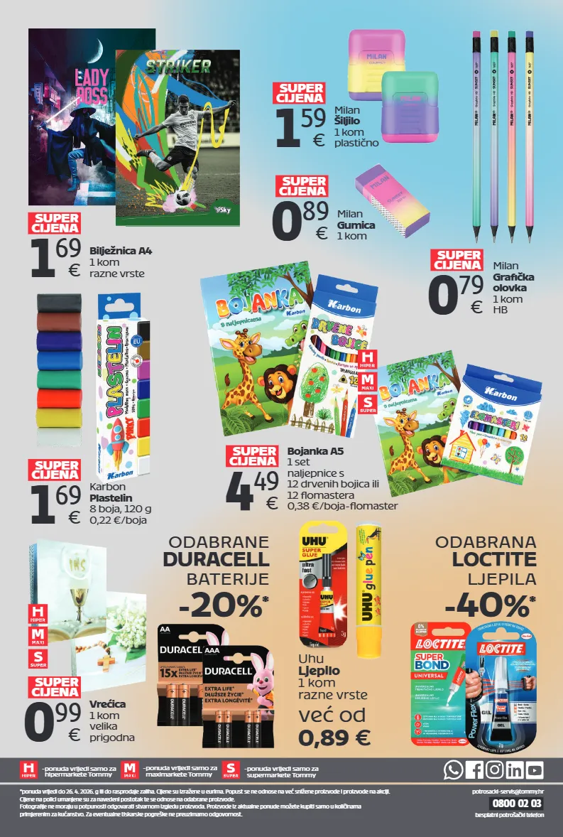 0800 02 03 *ponuda vrijedi do 26. 4. 2026. g ili do rasprodaje zaliha. cijene su izražene u eurima. popust se ne odnose na već snižene proizvode i proizvode na akciji. cijene na polici umanjene su za navedeni postotak te se odnose na odabrane proizvode. fotografije ne moraju u potpunosti odgovarati stvarnom izgledu proizvoda. proizvode iz aktualne ponude možete kupiti samo u količinama primjerenim za kućanstvo. za eventualne tiskarske pogreške ne preuzimamo odgovornost. besplatni potrošački telefon potrosacki-servis@tommy.hr -ponuda vrijedi samo za maximarkete tommy -ponuda vrijedi samo za hipermarkete tommy -ponuda vrijedi samo za supermarkete tommy super cijena 1 69 € bilježnica a4 1 kom razne vrste super cijena 0 79 € milan grafička olovka 1 kom hb super cijena 0 89 € milan gumica 1 kom super cijena 1 69 € karbon plastelin 8 boja, 120 g 0,22 €/boja super cijena 4 49 € bojanka a5 1 set naljepnice s 12 drvenih bojica ili 12 flomastera 0,38 €/boja-flomaster super cijena 0 99 € vrećica 1 kom velika prigodna - 20 % * odabrane duracell baterije - 40 % * odabrana loctite ljepila već od 0,89 € uhu ljepilo 1 kom razne vrste super cijena 1 59 € milan šiljilo 1 kom plastično