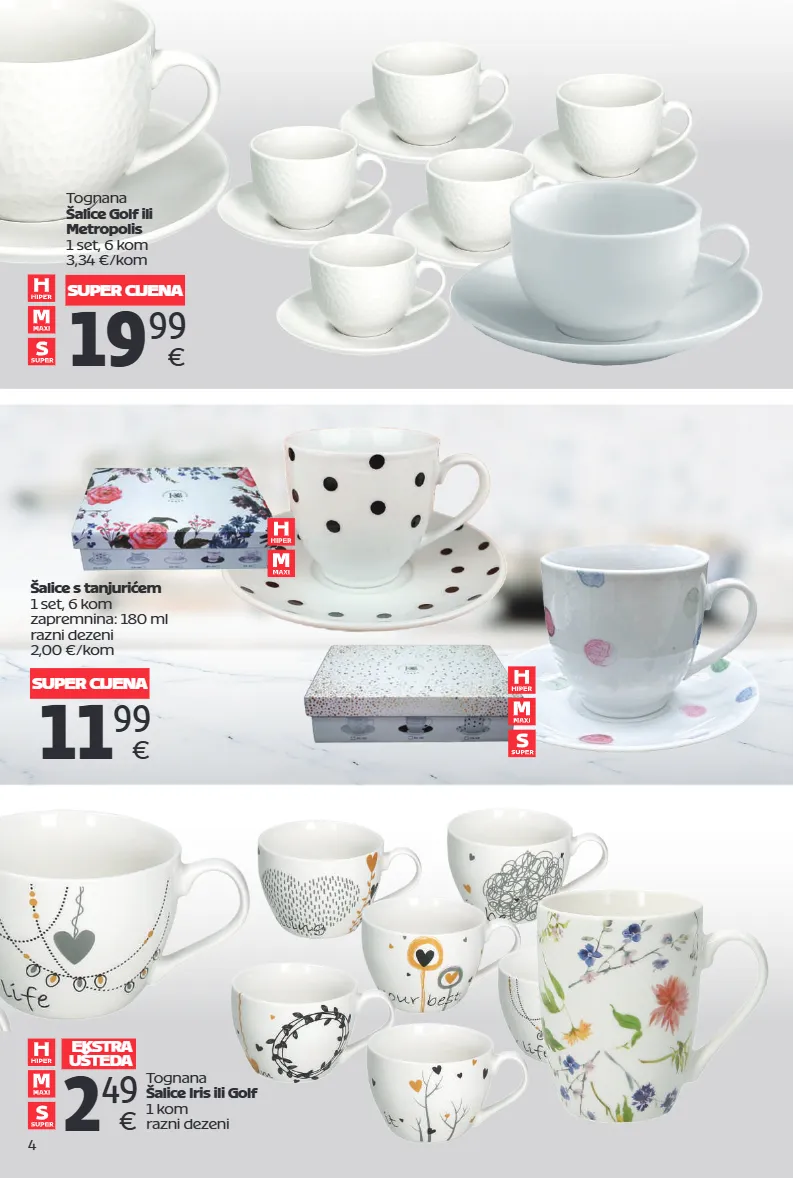4 2 49 € Tognana Šalice Iris ili Golf 1 kom razni dezeni ekstra ušteda 19 99 € Tognana Šalice Golf ili Metropolis 1 set, 6 kom 3,34 €/kom super cijena Šalice s tanjurićem 1 set, 6 kom zapremnina: 180 ml razni dezeni 2,00 €/kom 11 99 € super cijena
