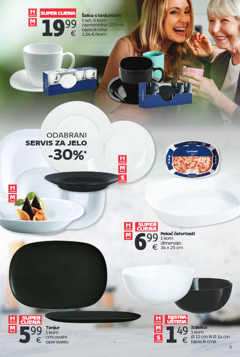 5 19 99 € šalice s tanjurićem 1 set, 6 kom zapremnina: 220 ml bijela ili crna 3,34 €/kom super cijena super cijena 6 99 € pekač četvrtasti 1 kom dimenzije: 34 x 25 cm - 30 % * odabrani servis za jelo super cijena 5 99 € tanjur 1 kom crni ovalni opal staklo 1 49 € zdjelica 1 kom ø 12 cm ili ø 14 cm bijela ili crna ekstra ušteda