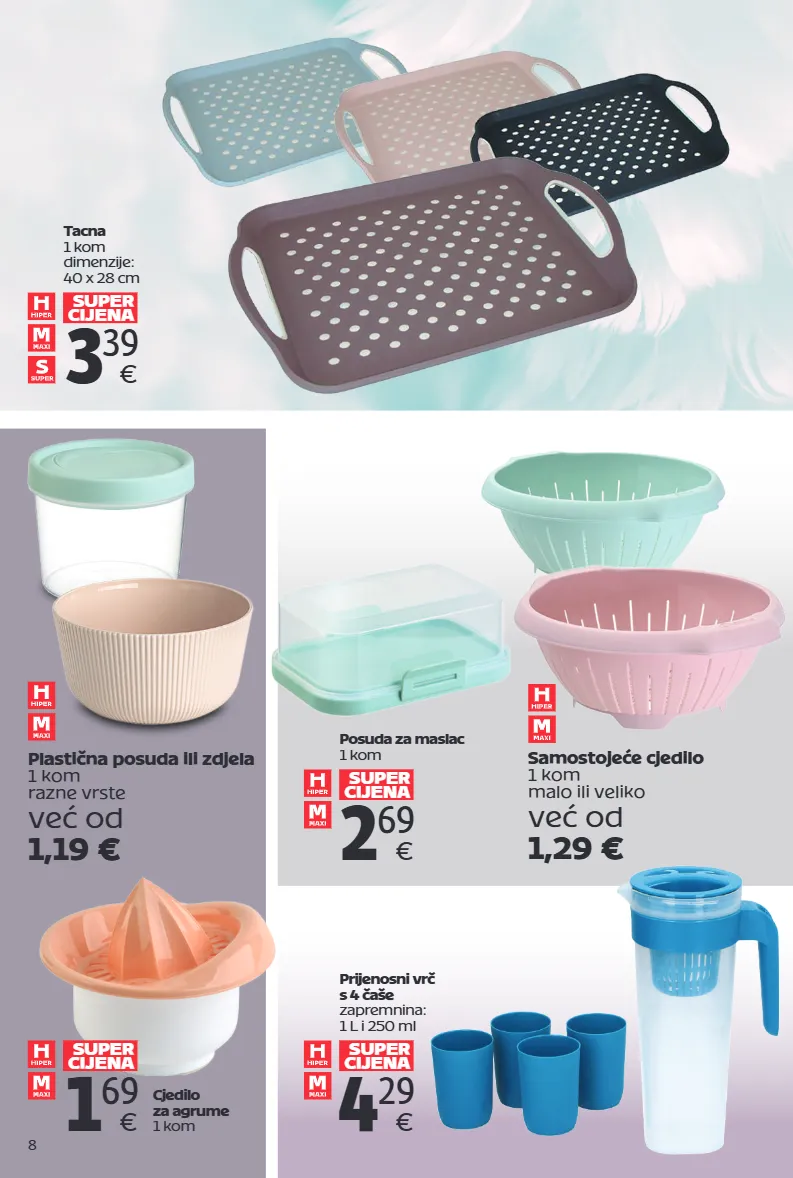 8 super cijena 3 39 € tacna 1 kom dimenzije: 40 x 28 cm super cijena 2 69 € posuda za maslac 1 kom već od 1,19 € plastična posuda ili zdjela 1 kom razne vrste već od 1,29 € samostojeće cjedilo 1 kom malo ili veliko super cijena 1 69 € cjedilo za agrume 1 kom super cijena 4 29 € prijenosni vrč s 4 čaše zapremnina: 1 l i 250 ml
