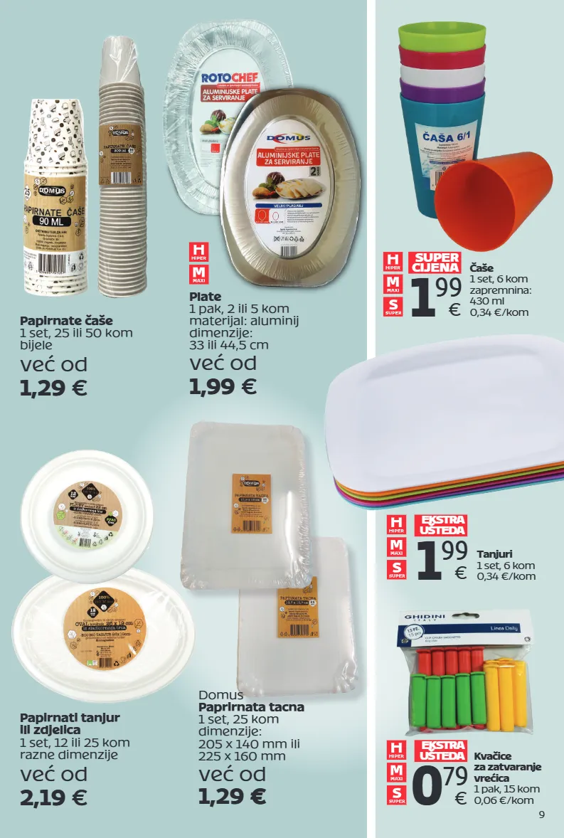 9 već od 1,29 € Domus Paprirnata tacna 1 set, 25 kom dimenzije: 205 x 140 mm ili 225 x 160 mm super cijena 1 99 € Čaše 1 set, 6 kom zapremnina: 430 ml 0,34 €/kom ekstra ušteda 0 79 € Kvačice za zatvaranje vrećica 1 pak, 15 kom 0,06 €/kom ekstra ušteda 1 99 € Tanjuri 1 set, 6 kom 0,34 €/kom već od 2,19 € Papirnati tanjur ili zdjelica 1 set, 12 ili 25 kom razne dimenzije već od 1,29 € Papirnate čaše 1 set, 25 ili 50 kom bijele već od 1,99 € Plate 1 pak, 2 ili 5 kom materijal: aluminij dimenzije: 33 ili 44,5 cm