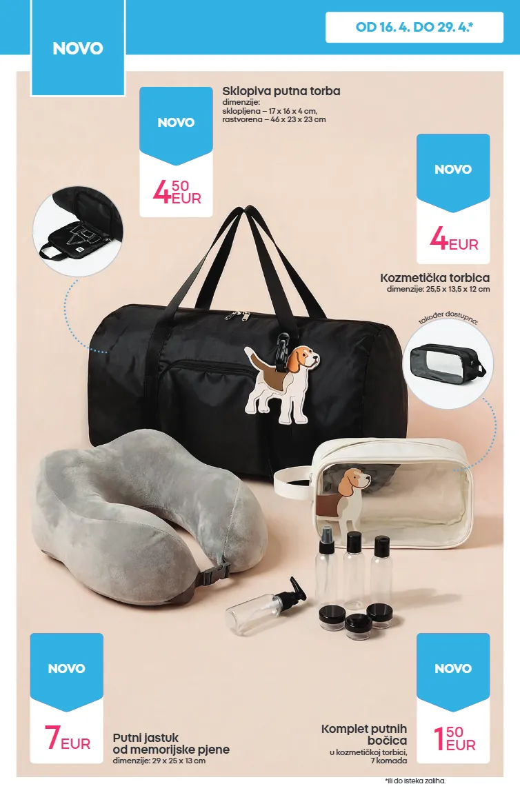 kozmetička torbica dimenzije: 25,5 x 13,5 x 12 cm komplet putnih bočica u kozmetičkoj torbici, 7 komada putni jastuk od memorijske pjene dimenzije: 29 x 25 x 13 cm sklopiva putna torba dimenzije: sklopljena – 17 x 16 x 4 cm, rastvorena – 46 x 23 x 23 cm 4 eur novo 1 50 eur novo 7 eur novo 4 50 eur novo t a k o đ e r d o s t u p n o : novo *ili do isteka zaliha. od 16. 4. do 29. 4.*