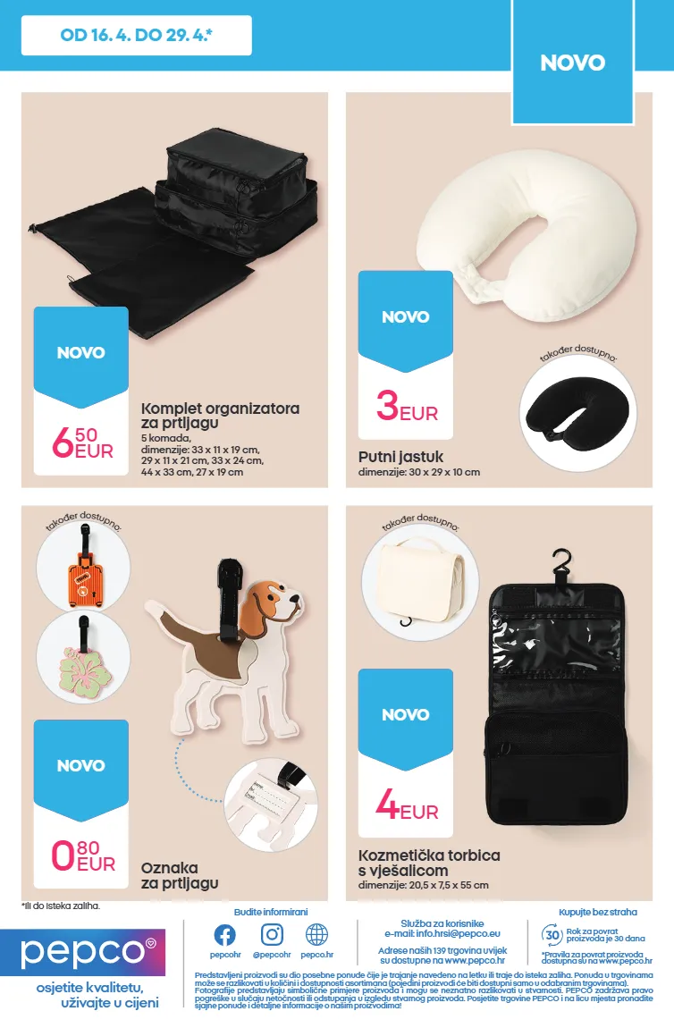 budite informirani adrese naših 139 trgovina uvijek su dostupne na www.pepco.hr služba za korisnike e-mail: info.hrsi@pepco.eu kupujte bez straha *pravila za povrat proizvoda dostupna su na www.pepco.hr rok za povrat proizvoda je 30 dana pepcohr pepco.hr @pepcohr predstavljeni proizvodi su dio posebne ponude čije je trajanje navedeno na letku ili traje do isteka zaliha. ponuda u trgovinama može se razlikovati u količini i dostupnosti asortimana (pojedini proizvodi će biti dostupni samo u odabranim trgovinama). fotografije predstavljaju simbolične primjere proizvoda i mogu se neznatno razlikovati u stvarnosti. pepco zadržava pravo pogreške u slučaju netočnosti ili odstupanja u izgledu stvarnog proizvoda. posjetite trgovine pepco i na licu mjesta pronađite sjajne ponude i detaljne informacije o našim proizvodima! osjetite kvalitetu, uživajte u cijeni kozmetička torbica s vješalicom dimenzije: 20,5 x 7,5 x 55 cm oznaka za prtljagu putni jastuk dimenzije: 30 x 29 x 10 cm komplet organizatora za prtljagu 5 komada, dimenzije: 33 x 11 x 19 cm, 29 x 11 x 21 cm, 33 x 24 cm, 44 x 33 cm, 27 x 19 cm 4 eur novo 0 80 eur novo 3 eur novo 6 50 eur novo t a k o đ e r d o s t u p n o : t a k o đ e r d o s t u p n o : 631173_01- 10 t a k o đ e r d o s t u p n o : 631173_01- 10 631173_01- 10 novo *ili do isteka zaliha. od 16. 4. do 29. 4.*