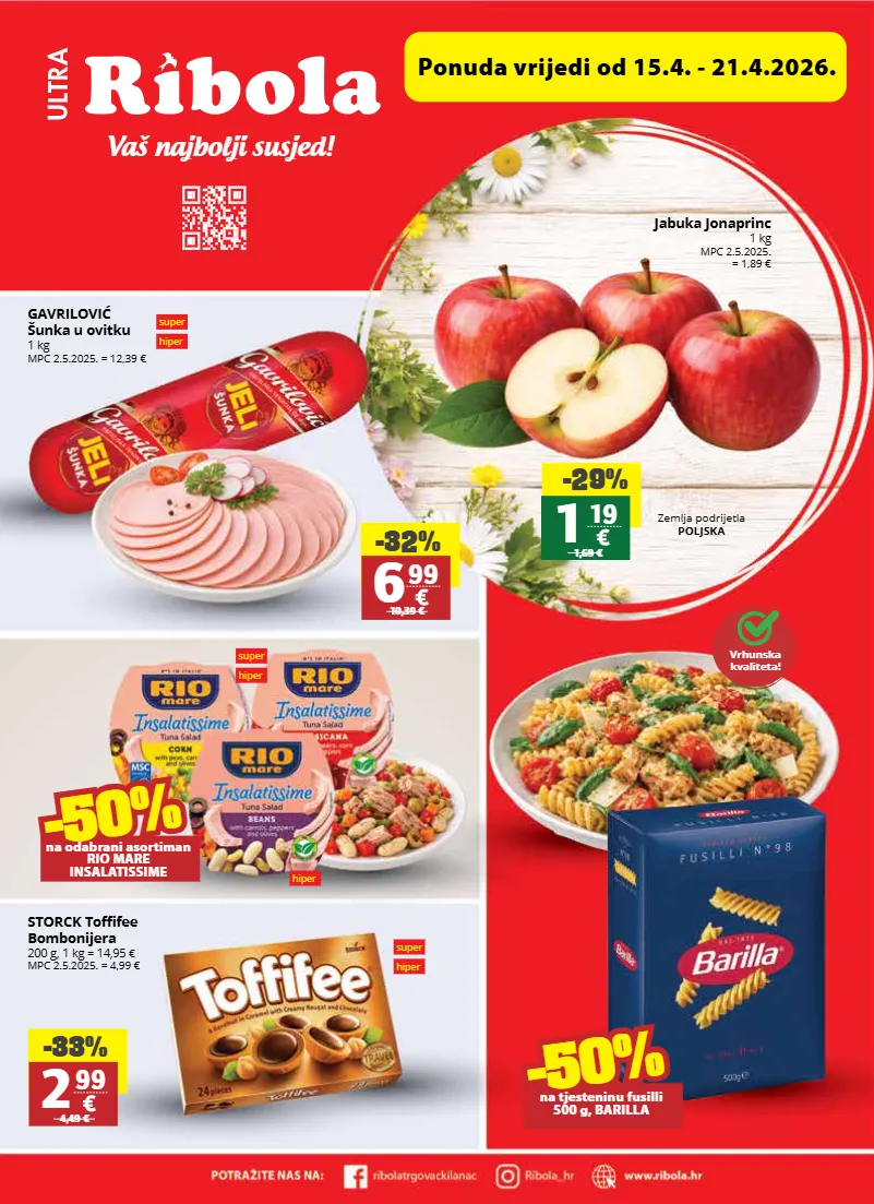 vaš najbolji susjed! ponuda vrijedi od 15.4. - 21.4.2026. super hiper super hiper hiper super hiper vrhunska kvaliteta! gavrilović šunka u ovitku 1 kg mpc 2.5.2025. = 12,39 € storck toffifee bombonijera 200 g, 1 kg = 14,95 € mpc 2.5.2025. = 4,99 € -50% -50% na tjesteninu fusilli 500 g, barilla -50% -50% na odabrani asortiman rio mare insalatissime -33% 2 99 4,49 € -32% 6 99 10,39 € -29% 1 19 1,69 € zemlja podrijetla poljska jabuka jonaprinc 1 kg mpc 2.5.2025. = 1,89 €