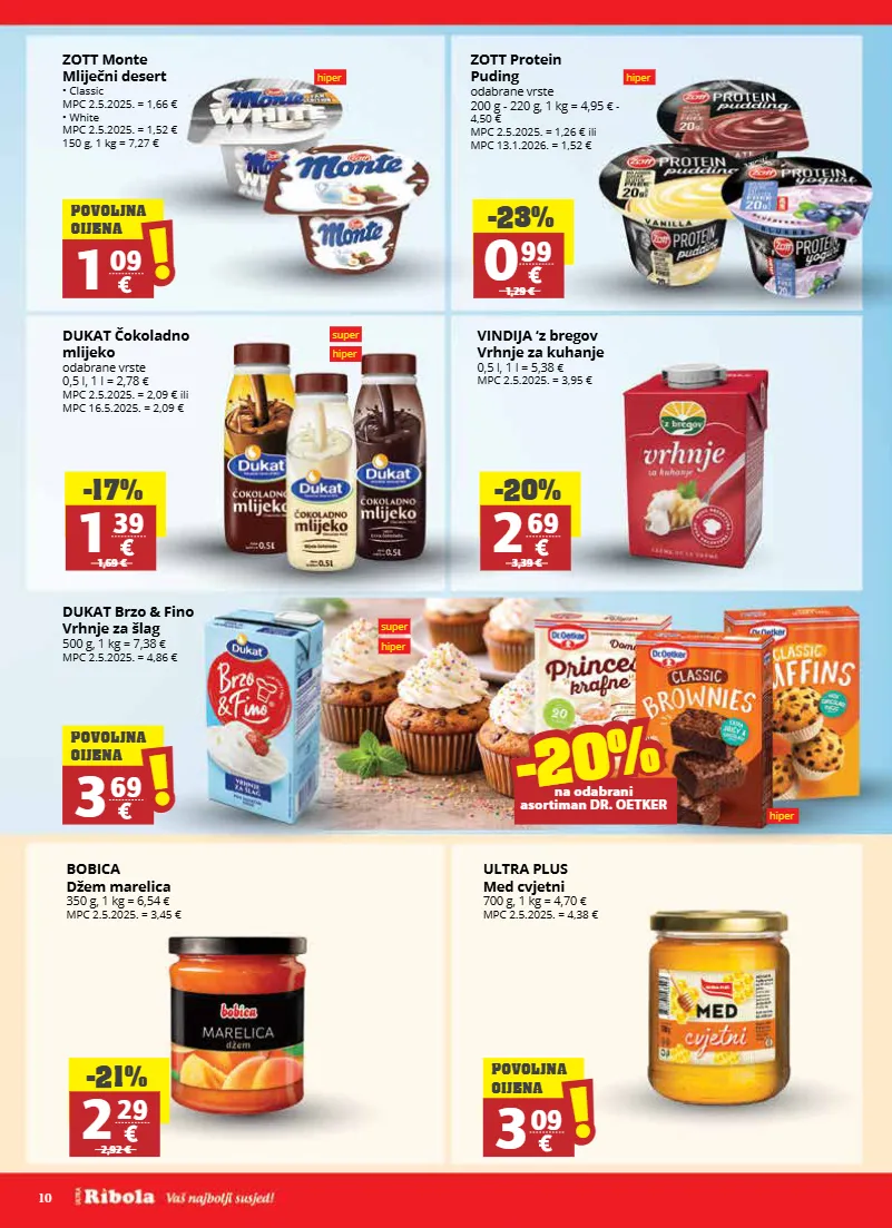 10 super hiper super hiper hiper hiper hiper zott protein puding odabrane vrste 200 g - 220 g, 1 kg = 4,95 € - 4,50 € mpc 2.5.2025. = 1,26 € ili mpc 13.1.2026. = 1,52 € dukat čokoladno mlijeko odabrane vrste 0,5 l, 1 l = 2,78 € mpc 2.5.2025. = 2,09 € ili mpc 16.5.2025. = 2,09 € vindija ‘z bregov vrhnje za kuhanje 0,5 l, 1 l = 5,38 € mpc 2.5.2025. = 3,95 € dukat brzo & fino vrhnje za šlag 500 g, 1 kg = 7,38 € mpc 2.5.2025. = 4,86 € bobica džem marelica 350 g, 1 kg = 6,54 € mpc 2.5.2025. = 3,45 € ultra plus med cvjetni 700 g, 1 kg = 4,70 € mpc 2.5.2025. = 4,38 € zott monte mliječni desert • classic mpc 2.5.2025. = 1,66 € • white mpc 2.5.2025. = 1,52 € 150 g, 1 kg = 7,27 € -23% 0 99 1,29 € -17% 1 39 1,69 € -20% 2 69 3,39 € -21% 2 29 2,92 € 1 09 ! ! povoljna cijena 3 69 ! ! povoljna cijena 3 09 ! ! povoljna cijena -20% -20% na odabrani asortiman dr. oetker