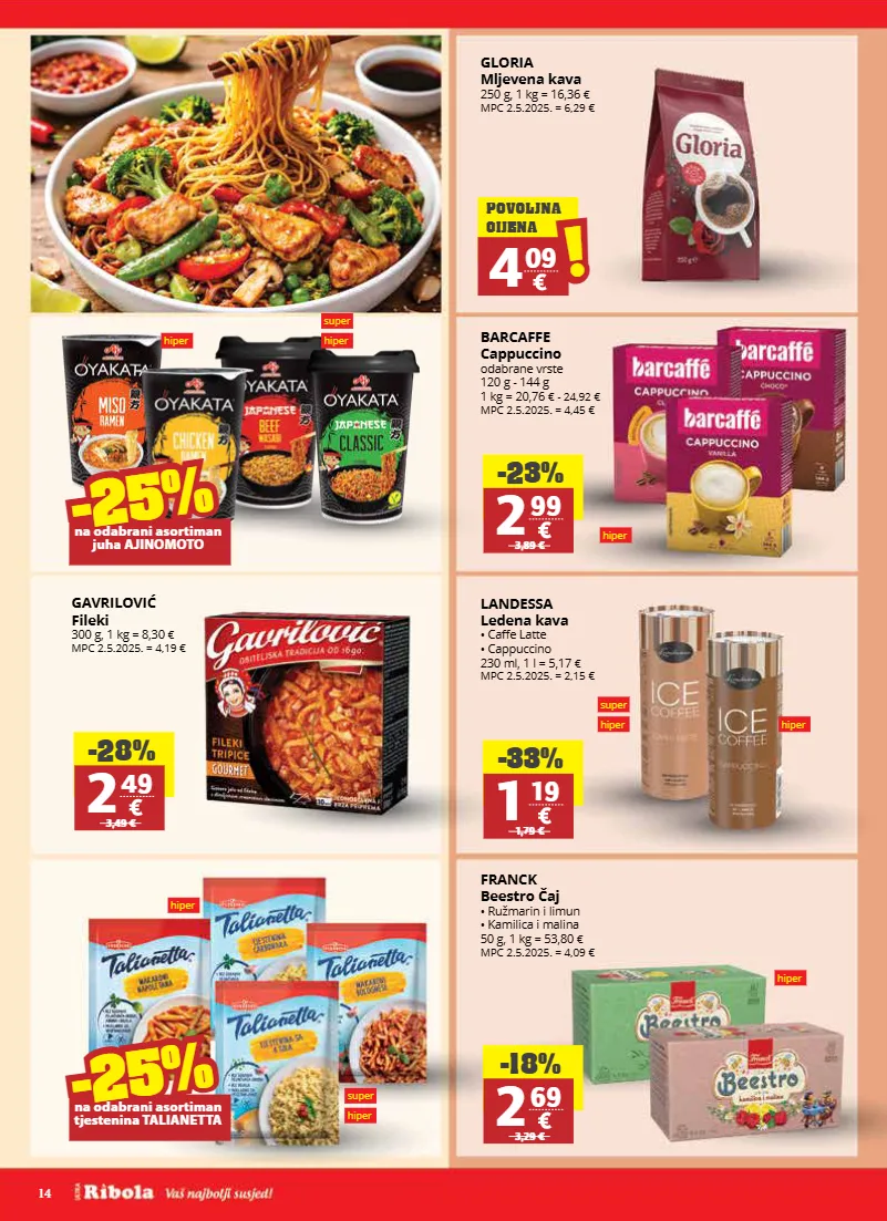 14 super hiper hiper super hiper super hiper hiper hiper hiper hiper gloria mljevena kava 250 g, 1 kg = 16,36 € mpc 2.5.2025. = 6,29 € barcaffe cappuccino odabrane vrste 120 g - 144 g 1 kg = 20,76 € - 24,92 € mpc 2.5.2025. = 4,45 € landessa ledena kava • caffe latte • cappuccino 230 ml, 1 l = 5,17 € mpc 2.5.2025. = 2,15 € franck beestro čaj • ružmarin i limun • kamilica i malina 50 g, 1 kg = 53,80 € mpc 2.5.2025. = 4,09 € gavrilović fileki 300 g, 1 kg = 8,30 € mpc 2.5.2025. = 4,19 € -28% 2 49 3,49 € -23% 2 99 3,89 € -33% 1 19 1,79 € -18% 2 69 3,29 € -25% -25% na odabrani asortiman juha ajinomoto -25% -25% na odabrani asortiman tjestenina talianetta 4 09 ! ! povoljna cijena