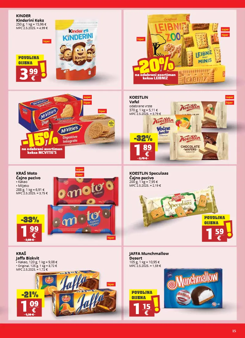 15 super hiper super hiper super hiper hiper super hiper hiper hiper hiper hiper kinder kinderini keks 250 g, 1 kg = 15,96 € mpc 2.5.2025. = 4,99 € koestlin vafel odabrane vrste 370 g, 1 kg = 5,11 € mpc 2.5.2025. = 3,79 € kraš moto čajno pecivo • kakao • mlijeko 288 g, 1 kg = 6,91 € mpc 2.5.2025. = 3,75 € koestlin speculaas čajno pecivo 200 g, 1 kg = 7,95 € mpc 2.5.2025. = 2,19 € kraš jaffa biskvit • kakao, 120 g, 1 kg = 9,08 € • original, 125 g, 1 kg = 8,72 € mpc 2.5.2025. = 1,72 € jaffa munchmallow desert 105 g, 1 kg = 10,95 € mpc 2.5.2025. = 1,59 € -32% 1 89 2,79 € -33% 1 99 2,99 € -21% 1 09 1,39 € 3 99 ! ! povoljna cijena 1 59 ! ! povoljna cijena 1 15 ! ! povoljna cijena -25% -20% na odabrani asortiman keksa leibniz -15% -15% na odabrani asortiman keksa mcvitie’s