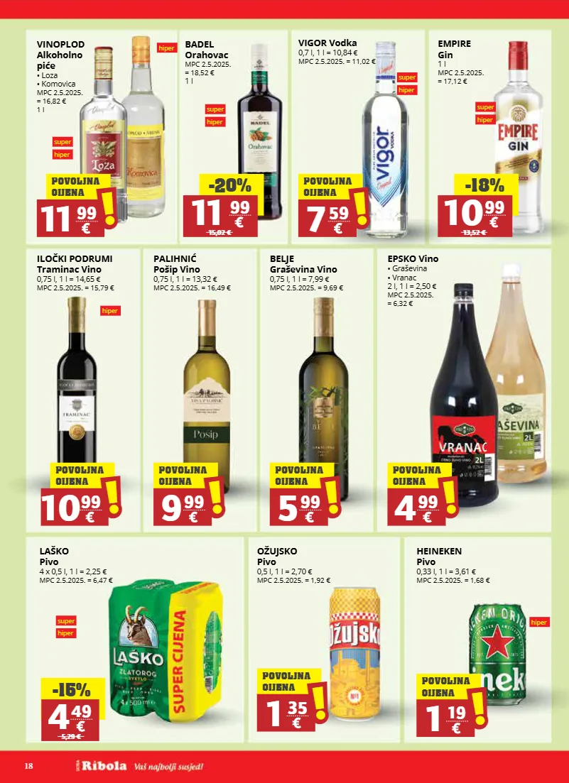 18 hiper vinoplod alkoholno piće • loza • komovica mpc 2.5.2025. = 16,82 € 1 l epsko vino • graševina • vranac 2 l, 1 l = 2,50 € mpc 2.5.2025. = 6,32 € 4 99 ! ! povoljna cijena ožujsko pivo 0,5 l, 1 l = 2,70 € mpc 2.5.2025. = 1,92 € 1 35 ! ! povoljna cijena belje graševina vino 0,75 l, 1 l = 7,99 € mpc 2.5.2025. = 9,69 € 5 99 ! ! povoljna cijena palihnić pošip vino 0,75 l, 1 l = 13,32 € mpc 2.5.2025. = 16,49 € 9 99 ! ! povoljna cijena 11 99 ! ! povoljna cijena laško pivo 4 x 0,5 l, 1 l = 2,25 € mpc 2.5.2025. = 6,47 € -15% 4 49 5,29 € super hiper empire gin 1 l mpc 2.5.2025. = 17,12 € -18% 10 99 13,52 € -20% 11 99 15,02 € super hiper super hiper super hiper vigor vodka 0,7 l, 1 l = 10,84 € mpc 2.5.2025. = 11,02 € 7 59 ! ! povoljna cijena super hiper heineken pivo 0,33 l, 1 l = 3,61 € mpc 2.5.2025. = 1,68 € 1 19 ! ! povoljna cijena hiper iločki podrumi traminac vino 0,75 l, 1 l = 14,65 € mpc 2.5.2025. = 15,79 € 10 99 ! ! povoljna cijena hiper badel orahovac mpc 2.5.2025. = 18,52 € 1 l