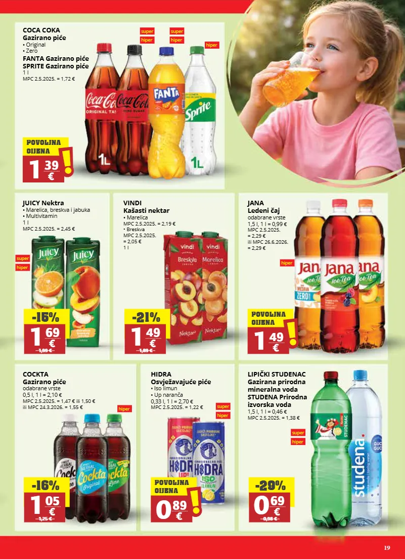 19 juicy nektra • marelica, breskva i jabuka • multivitamin 1 l mpc 2.5.2025. = 2,45 € jana ledeni čaj odabrane vrste 1,5 l, 1 l = 0,99 € mpc 2.5.2025. = 2,29 € ili mpc 26.6.2026. = 2,29 € cockta gazirano piće odabrane vrste 0,5 l, 1 l = 2,10 € mpc 2.5.2025. = 1,47 € ili 1,50 € ili mpc 24.3.2026. = 1,55 € lipički studenac gazirana prirodna mineralna voda studena prirodna izvorska voda 1,5 l, 1 l = 0,46 € mpc 2.5.2025. = 1,38 € hidra osvježavajuće piće • iso limun • up naranča 0,33 l, 1 l = 2,70 € mpc 2.5.2025. = 1,22 € coca coka gazirano piće • original • zero fanta gazirano piće sprite gazirano piće 1 l mpc 2.5.2025. = 1,72 € vindi kašasti nektar • marelica mpc 2.5.2025. = 2,19 € • breskva mpc 2.5.2025. = 2,05 € 1 l -15% 1 69 1,99 € -21% 1 49 1,89 € -16% 1 05 1,25 € -29% 0 69 0,98 € 1 49 ! ! povoljna cijena 0 89 ! ! povoljna cijena 1 39 ! ! povoljna cijena super hiper super hiper super hiper hiper hiper hiper super hiper super hiper