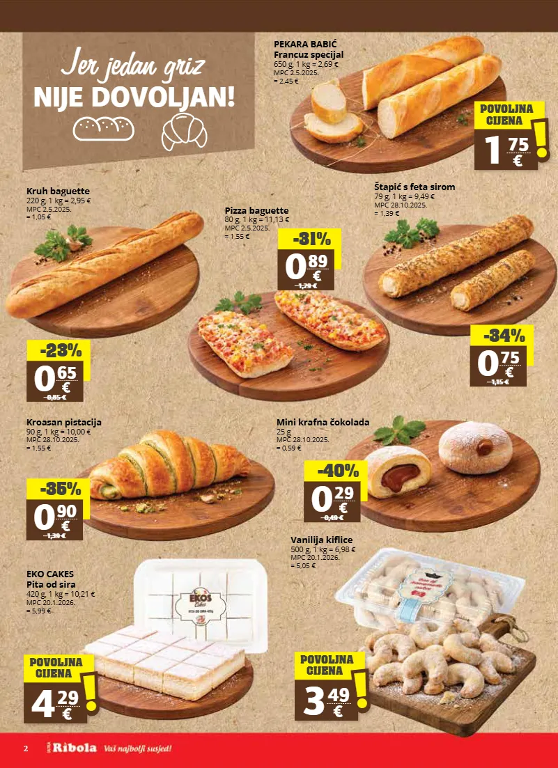 2 jer jedan griz nije dovoljan! 1 75 povoljna cijena ! ! 4 29 povoljna cijena ! ! 3 49 povoljna cijena ! ! -23% 0 65 0,85 € -31% 0 89 1,29 € -34% 0 75 1,15 € -35% 0 90 1,39 € -40% 0 29 0,49 € pekara babić francuz specijal 650 g, 1 kg = 2,69 € mpc 2.5.2025. = 2,45 € kruh baguette 220 g, 1 kg = 2,95 € mpc 2.5.2025. = 1,05 € pizza baguette 80 g, 1 kg = 11,13 € mpc 2.5.2025. = 1,55 € štapić s feta sirom 79 g, 1 kg = 9,49 € mpc 28.10.2025. = 1,39 € kroasan pistacija 90 g, 1 kg = 10,00 € mpc 28.10.2025. = 1,55 € mini krafna čokolada 25 g mpc 28.10.2025. = 0,59 € eko cakes pita od sira 420 g, 1 kg = 10,21 € mpc 20.1.2026. = 5,99 € vanilija kiflice 500 g, 1 kg = 6,98 € mpc 20.1.2026. = 5,05 € !